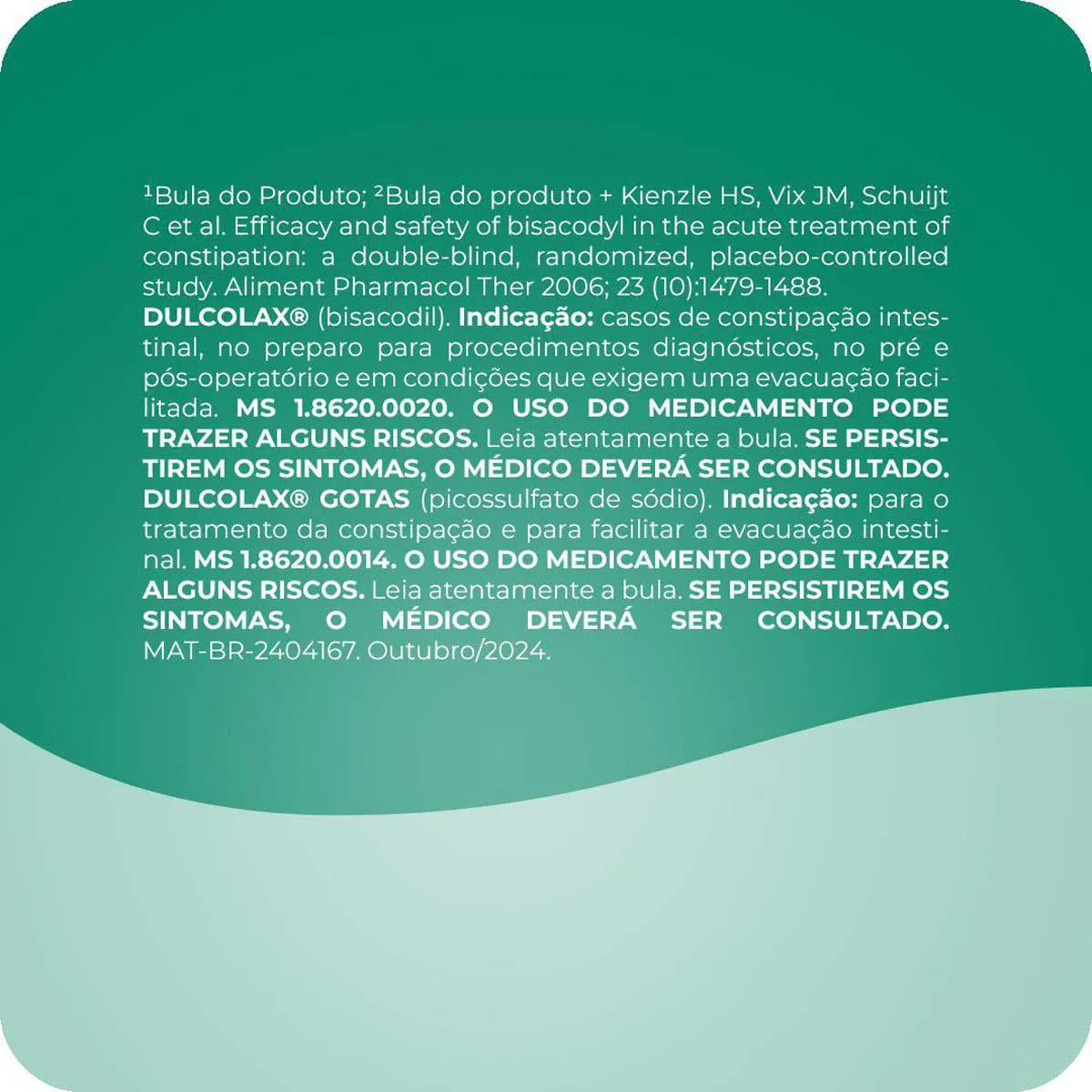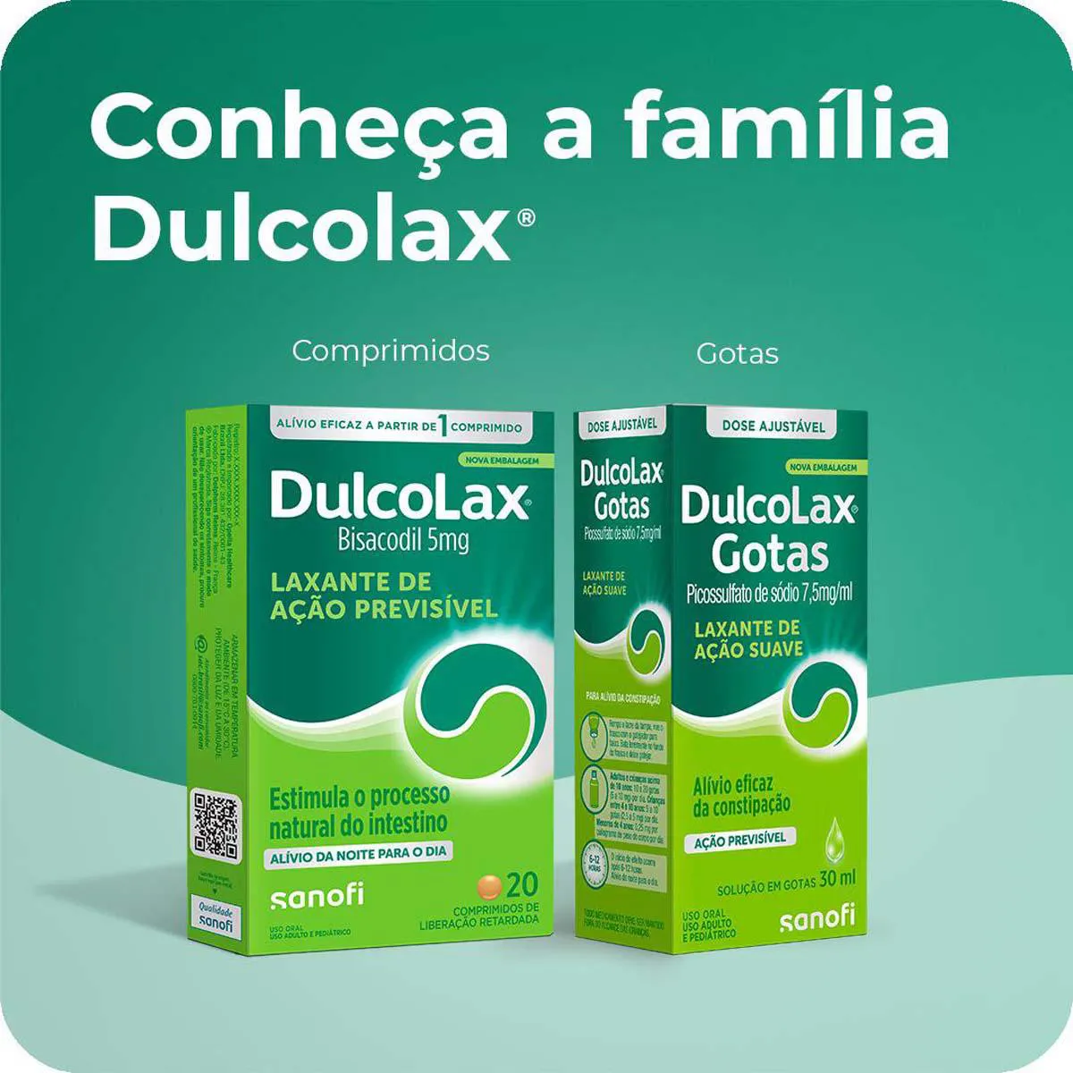 Dulcolax® é a marca de laxantes nº 1 no mundo e é indicado para o tratamento da constipação intestinal ou prisão de ventre. Atua de maneira previsível, agindo durante a noite para que o alívio ocorra na manhã seguinte, com efeito que dura de 6 a 12 horas. Em seu formato gotas, permite que a dosagem seja controlada conforme a necessidade, facilitando a evacuação e reativando o ritmo natural do intestino.