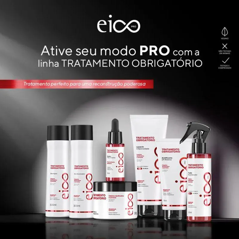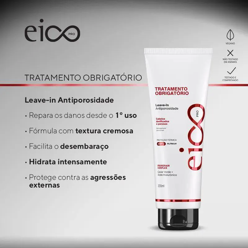 Leave-in para todos os tipos de cabelo. Eico Pro Tratamento Obrigatório Leave-In oferece proteção térmica, desembaraço imediato e tratamento diário para fios mais fortes, macios e alinhados. Com fórmula rica em ativos reparadores, o leave-in age como finalizador e protetor, ideal para quem usa ferramentas de calor como secador e chapinha. Além disso, ajuda a controlar o frizz, proporcionar brilho e manter os fios disciplinados por mais tempo. Ação:- Proteção térmica até 230°C
