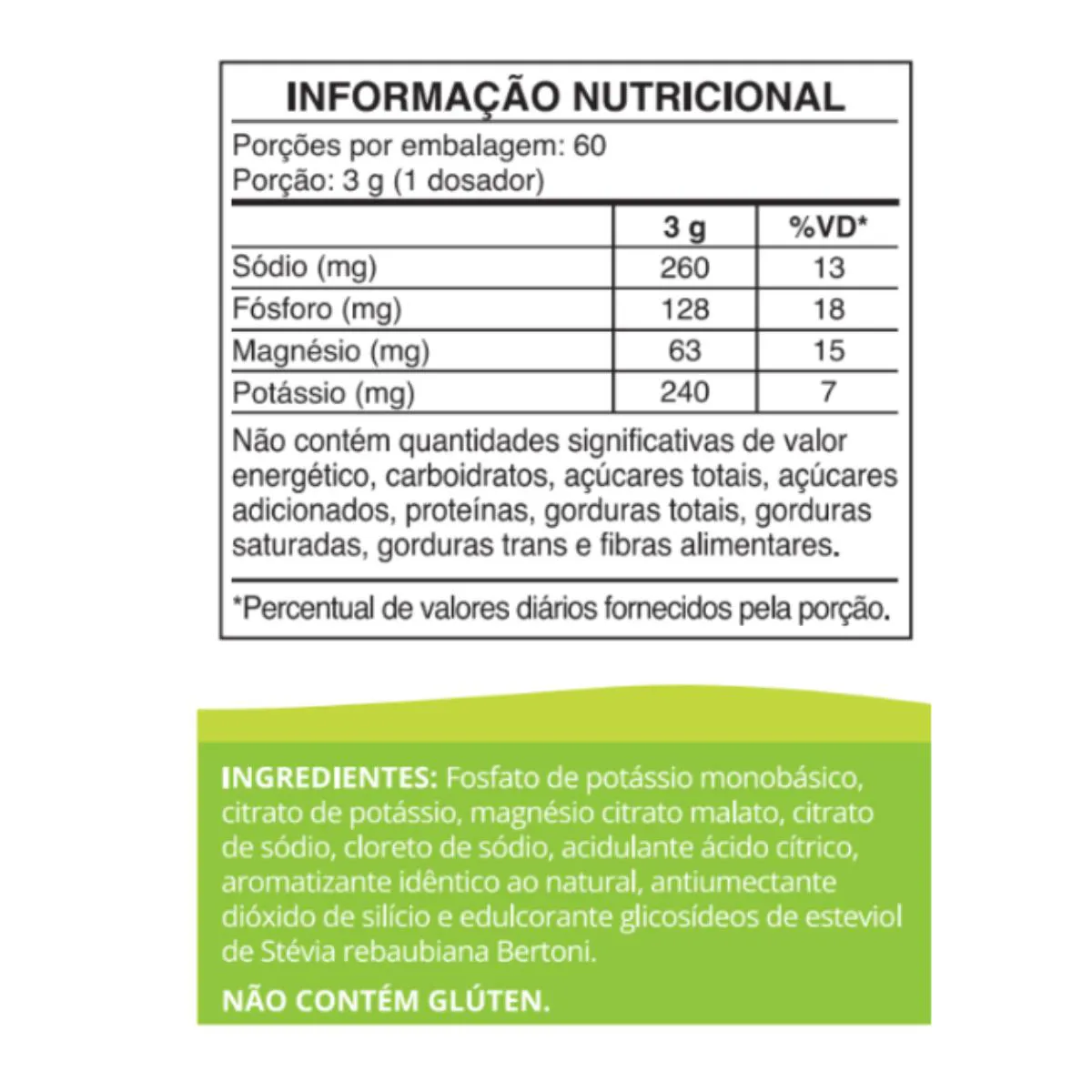 Este produto é indicado para maiores de 19 anos. Gestantes, lactantes e crianças não devem consumi-lo e a recomendação diária de consumo indicada na embalagem, de 3 gramas, não deve ser ultrapassada. O uso de suplementos eletrolíticos pode ser contraindicado, ou precisar de supervisão médica, em casos de insuficiência renal, hipercalcemia (níveis elevados de potássio no sangue), hipermagnesemia (níveis elevados de magnésio no sangue), hipertensão, doença hepática avançada e uso de medicamentos diuréticos ou anti-hipertensivos. Ressaltamos a importância de não exceder a dose recomendada, seguindo as instruções de uso, pelo fabricante ou pelo profissional de saúde.