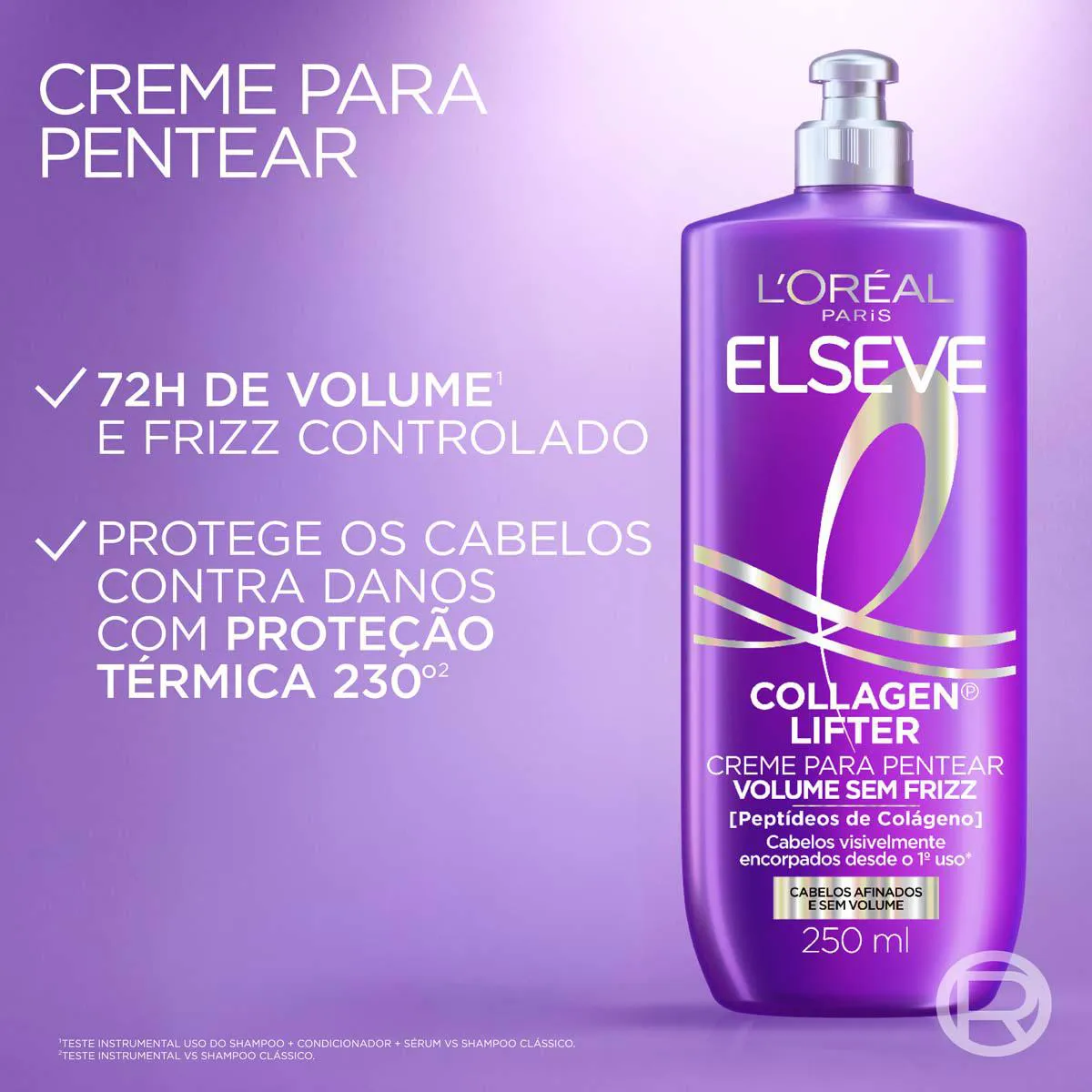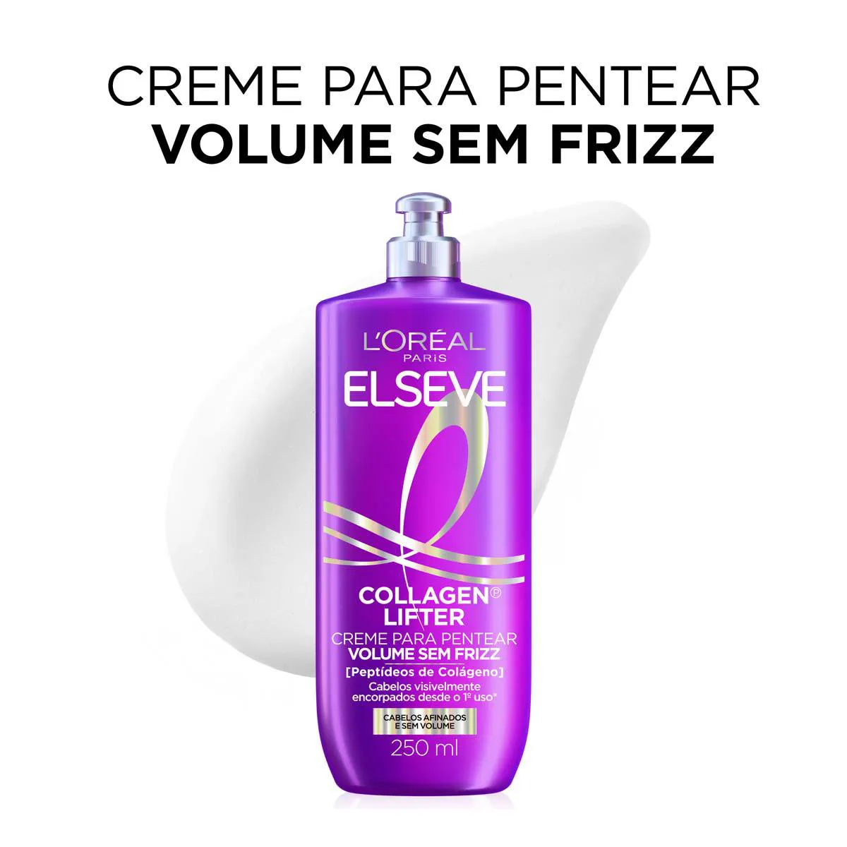 O Creme Para Pentear Volume Sem Frizz Elseve Colágeno Lifter é um finalizador desenvolvido para adicionar volume, encorpar os fios e manter o frizz sob controle desde o primeiro uso. Enriquecido com o complexo exclusivo de peptídeos de colágeno vegetais da linha Colágeno Lifter, ele preserva a qualidade do fio, entrega acabamento modelado e oferece proteção térmica de até 230 °C, ideal para quem utiliza ferramentas de calor.