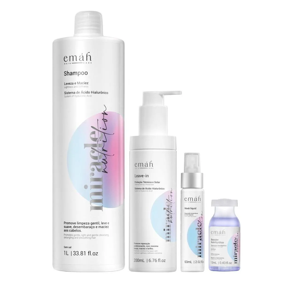 Kit Essencial Emáh Miracle Nutrition: shampoo 1L + Máscara Líquida 60ml + Leave-in 200ml + Óleo Restaurador 60ml