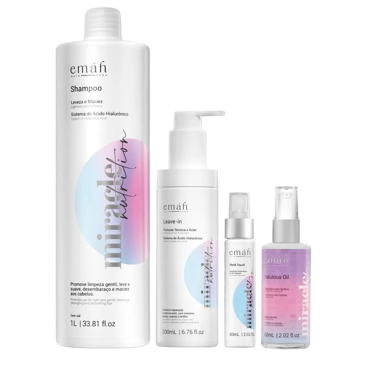 Kit Essencial Emáh Miracle Nutrition: shampoo 1L + Máscara Líquida 60ml + Leave-in 200ml + Óleo Restaurador 60ml
