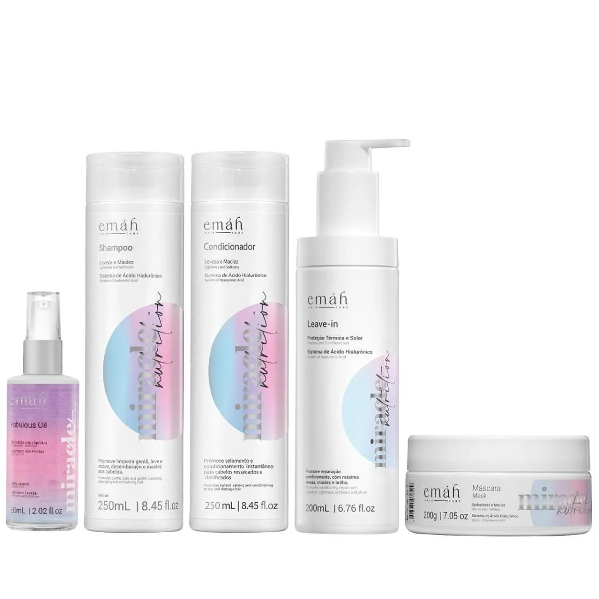 Kit Completo Emáh Miracle Nutrition: shampoo 250ml + condicionador 250ml + Máscara 200g + Leave-in 200ml + Óleo Restaurador 60ml