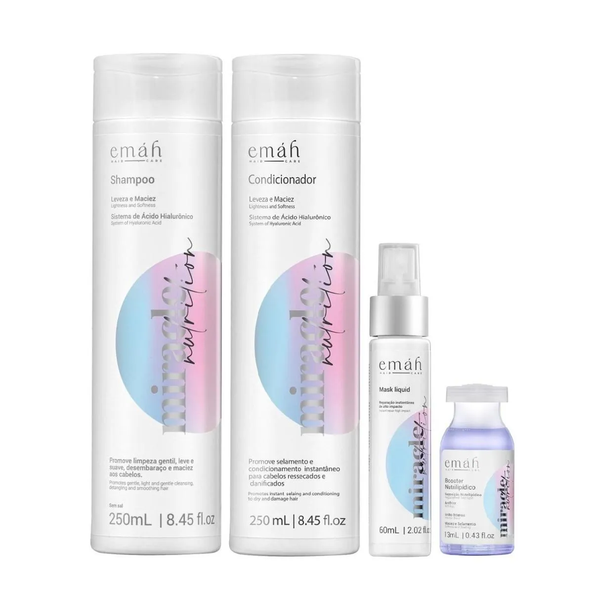 Kit Tratamento Potencializado Emáh Miracle Nutrition: shampoo 250ml + condicionador 250ml + Máscara Líquida 60ml + Ampola Booster 13ml