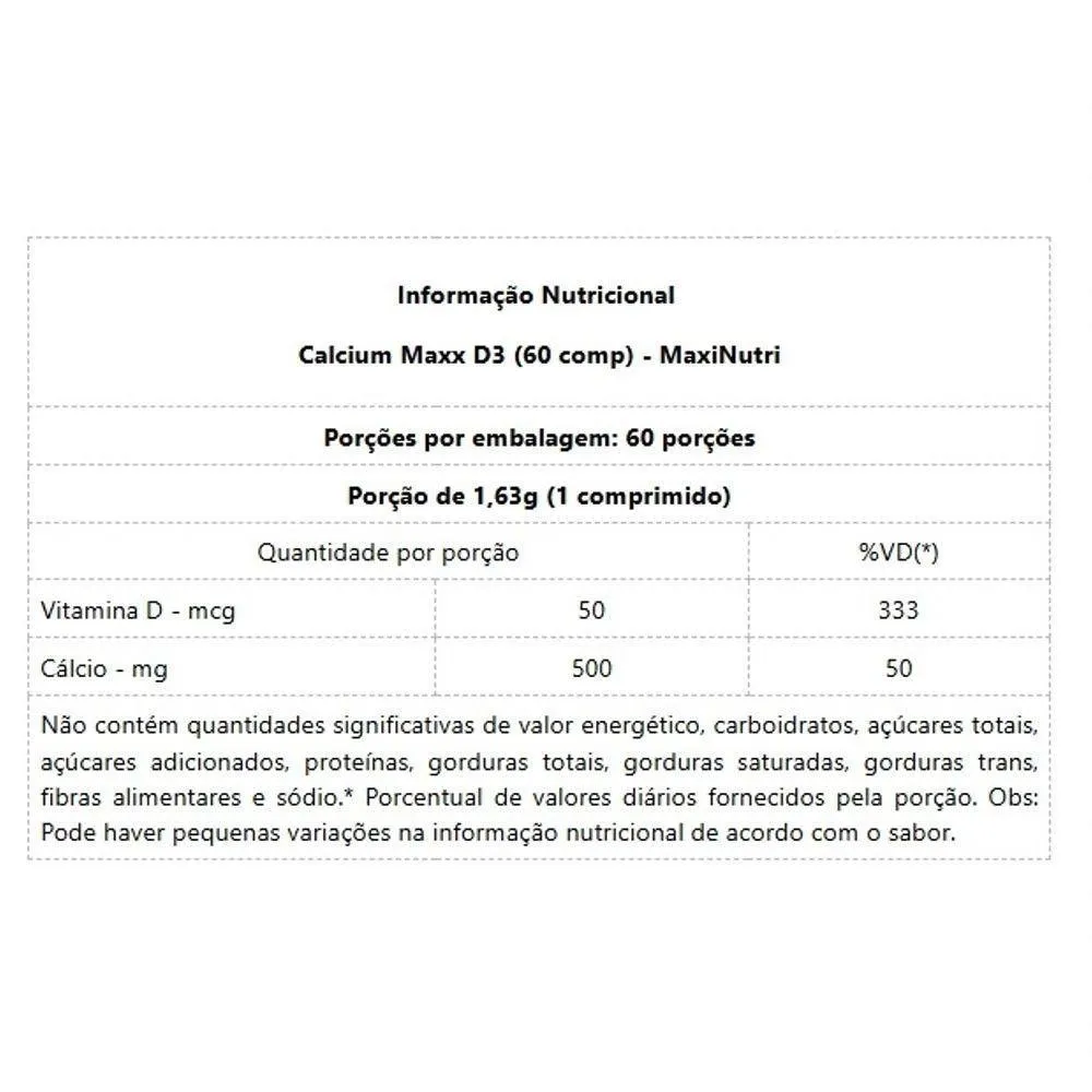 O Calcium Maxx D3 é um suplemento nutricional composto por 60 comprimidos, enriquecido com vitamina D3, desenvolvido para fortalecer os ossos e otimizar a absorção de cálcio no organismo. Seu objetivo principal é contribuir para a formação de uma estrutura óssea saudável, auxiliando na fixação eficiente do cálcio e prevenindo deficiências nutricionais que possam comprometer a saúde óssea.