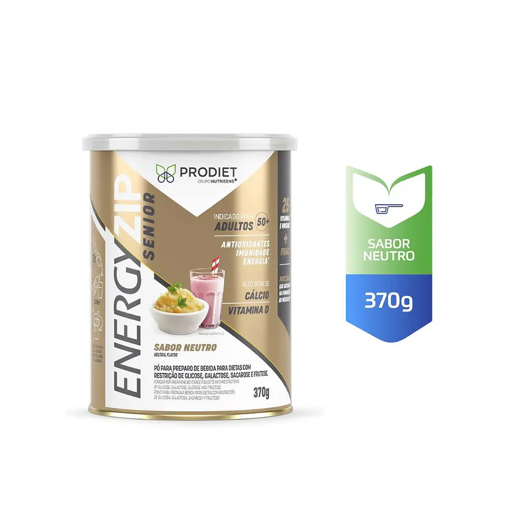 EnergyZip Senior Neutro da Prodiet é um suplemento alimentar em pó pensado para adultos acima de 50 anos, com sabor neutro que facilita seu consumo combinado a diferentes preparações.- Contribui para a ingestão diária de proteínas com 25% do conteúdo em proteína por porção