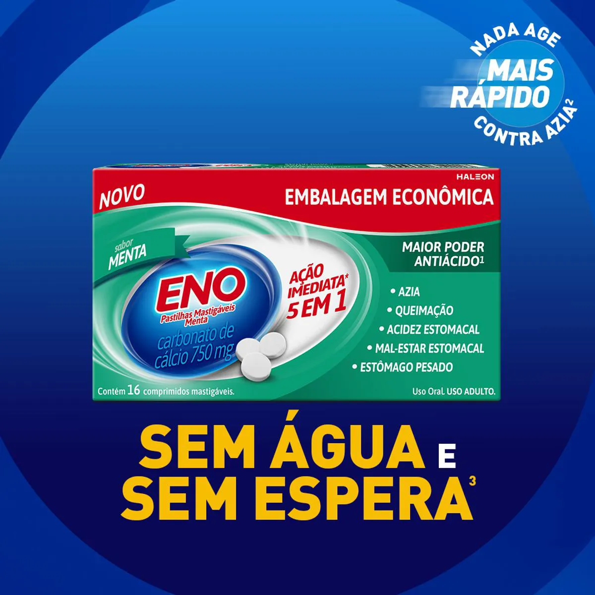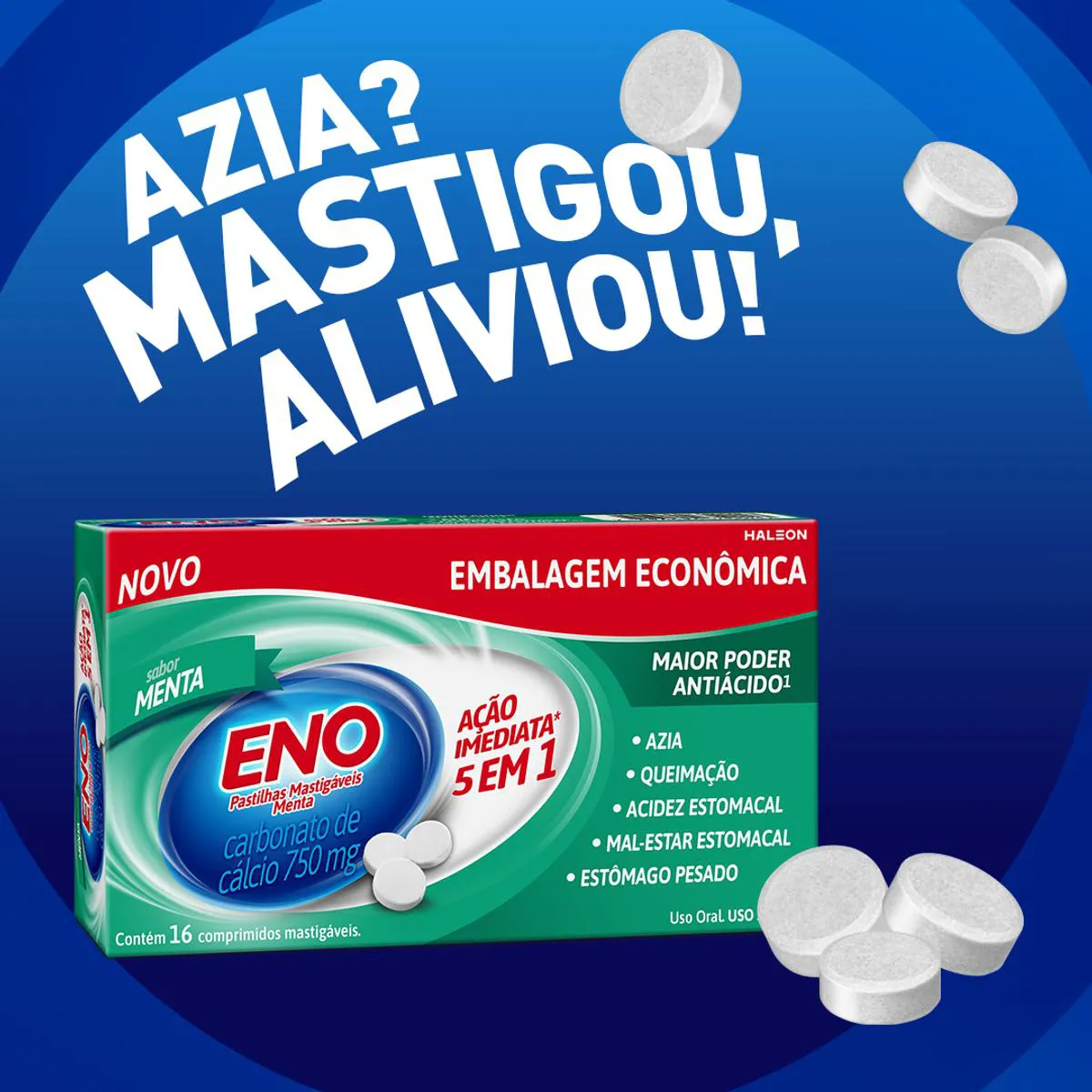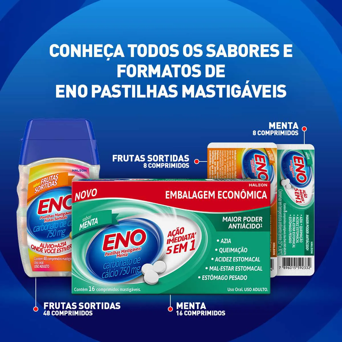 - Eno Pastilhas Mastigáveis é um antiácido prático para alívio da azia e queimação.