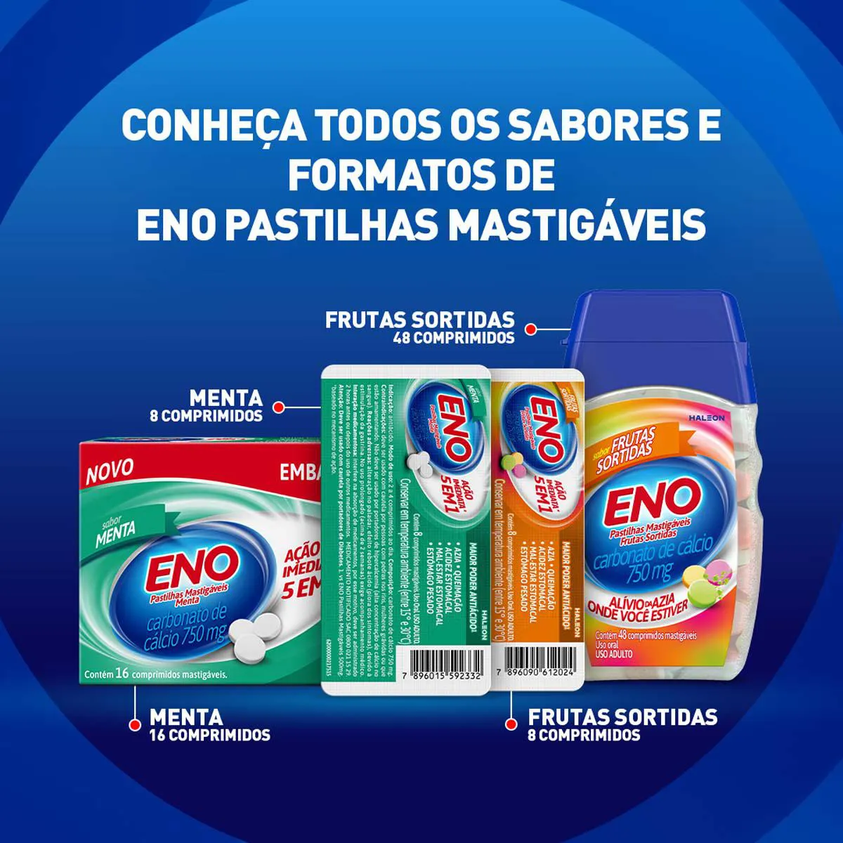 O carbonato de cálcio, princípio ativo do ENO Pastilhas Mastigáveis, neutraliza o ácido no esôfago e/ou estômago, aliviando o desconforto causado pela acidez.