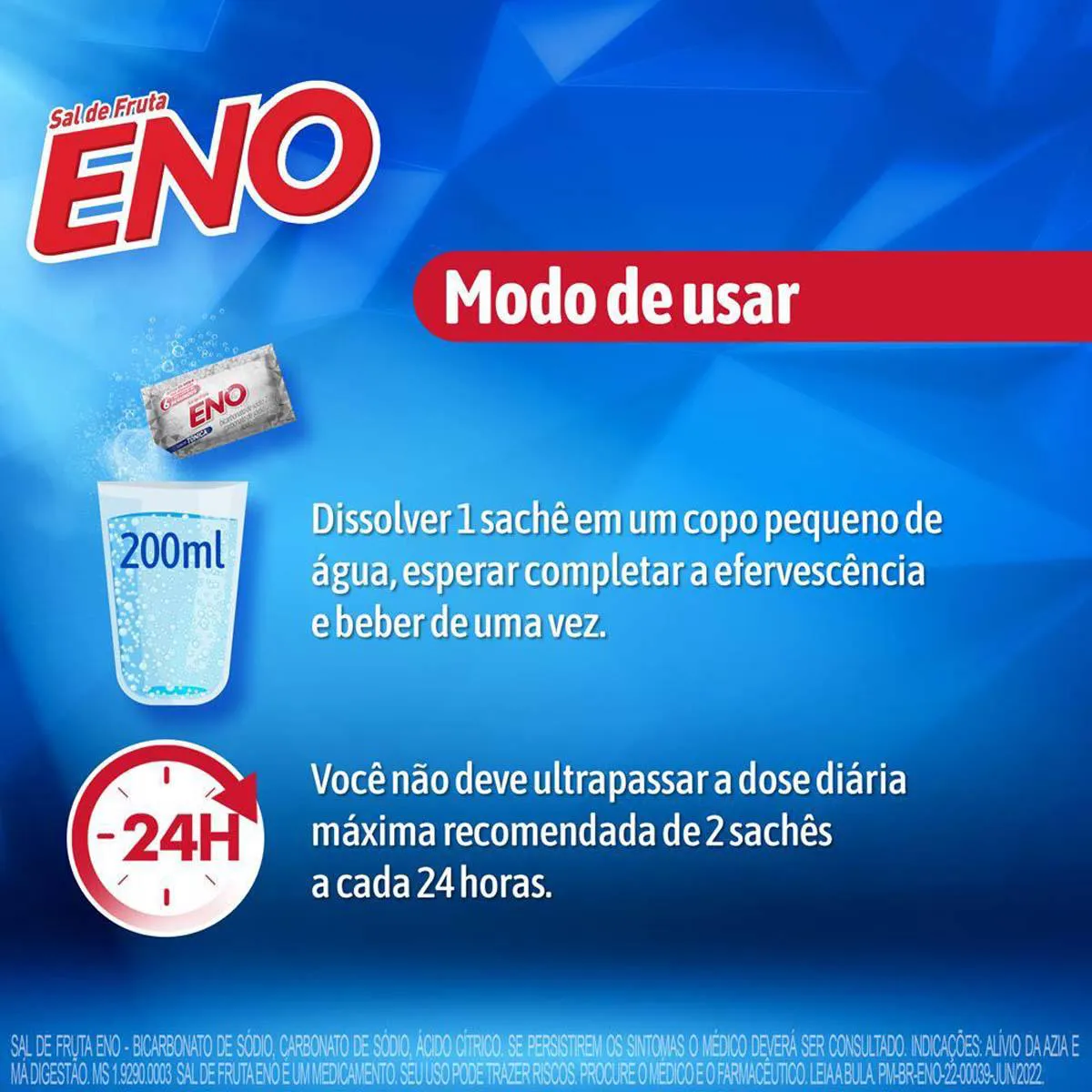 - Quando os sintomas ocorrerem, você deve dissolver 5g (conteúdo de 1 envelope ou 1 colher de chá) de Sal de Fruta Eno em um copo pequeno de água (200 ml) em temperatura ambiente.