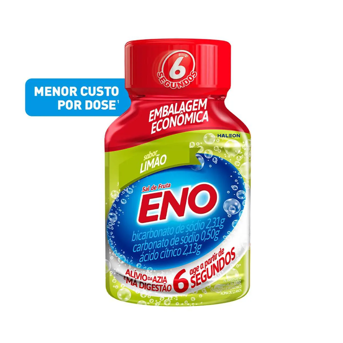 Os componentes do Sal de Frutas Eno quando dissolvidos em água, reagem entre si, produzindo um sal de efeito antiácido, capaz de iniciar a redução da acidez do estômago em 6 segundos.