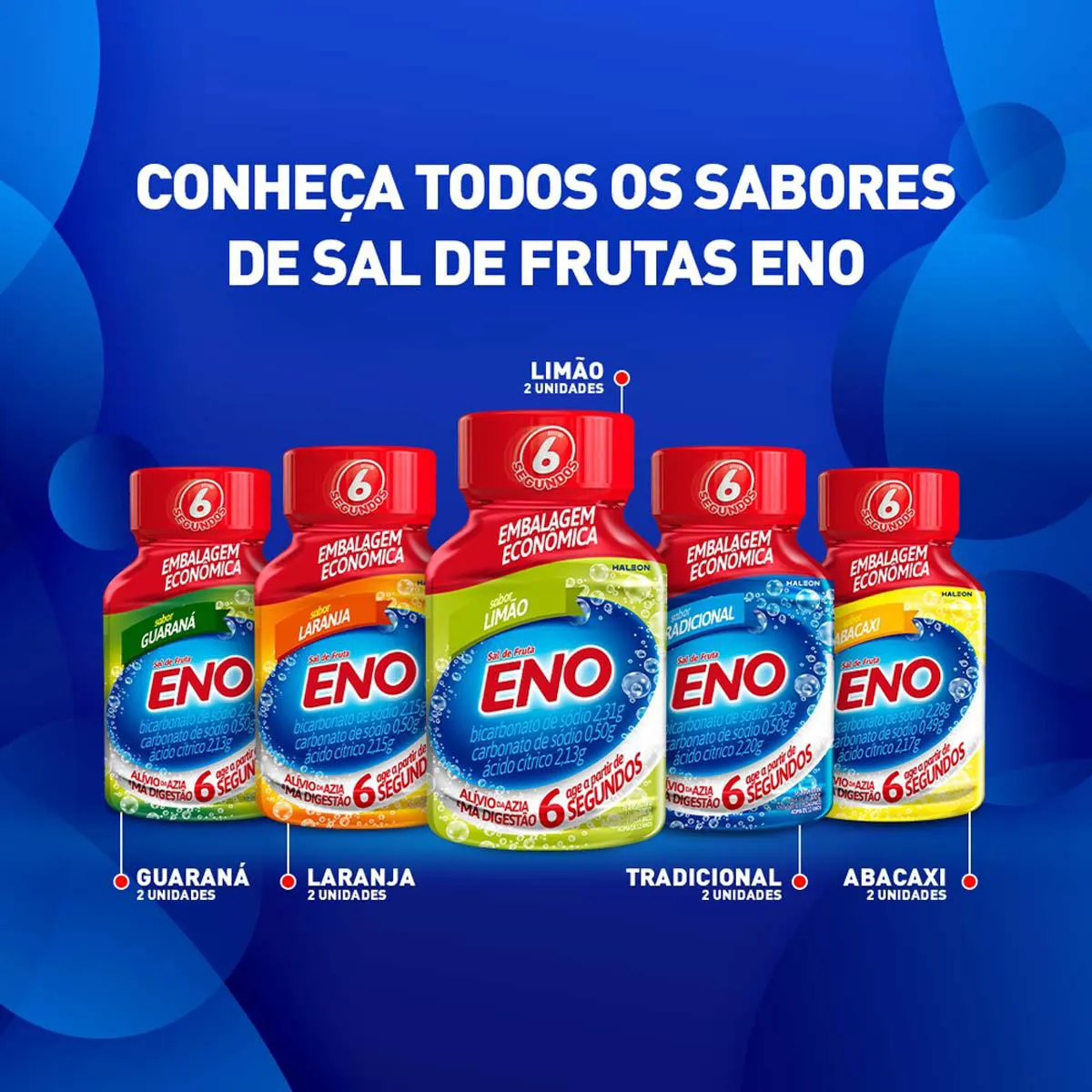 Sal de Fruta Eno está disponível em 6 sabores e 2 tamanhos: