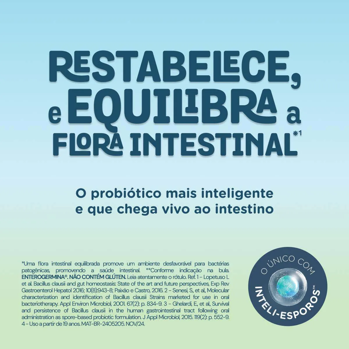O Bacillus clausii (probiótico) contribui para o equilíbrio da flora intestinal. Seu consumo deve estar associado a uma alimentação equilibrada e hábitos de vida saudáveis.