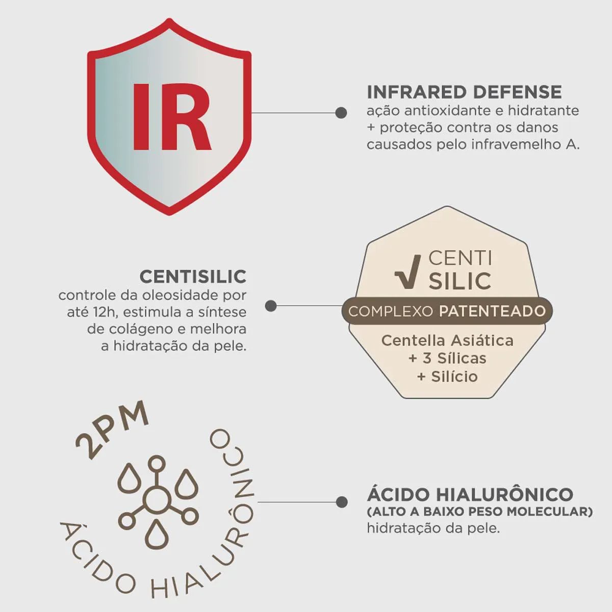 - Controla oleosidade e mantém hidratação por até 12 horas.