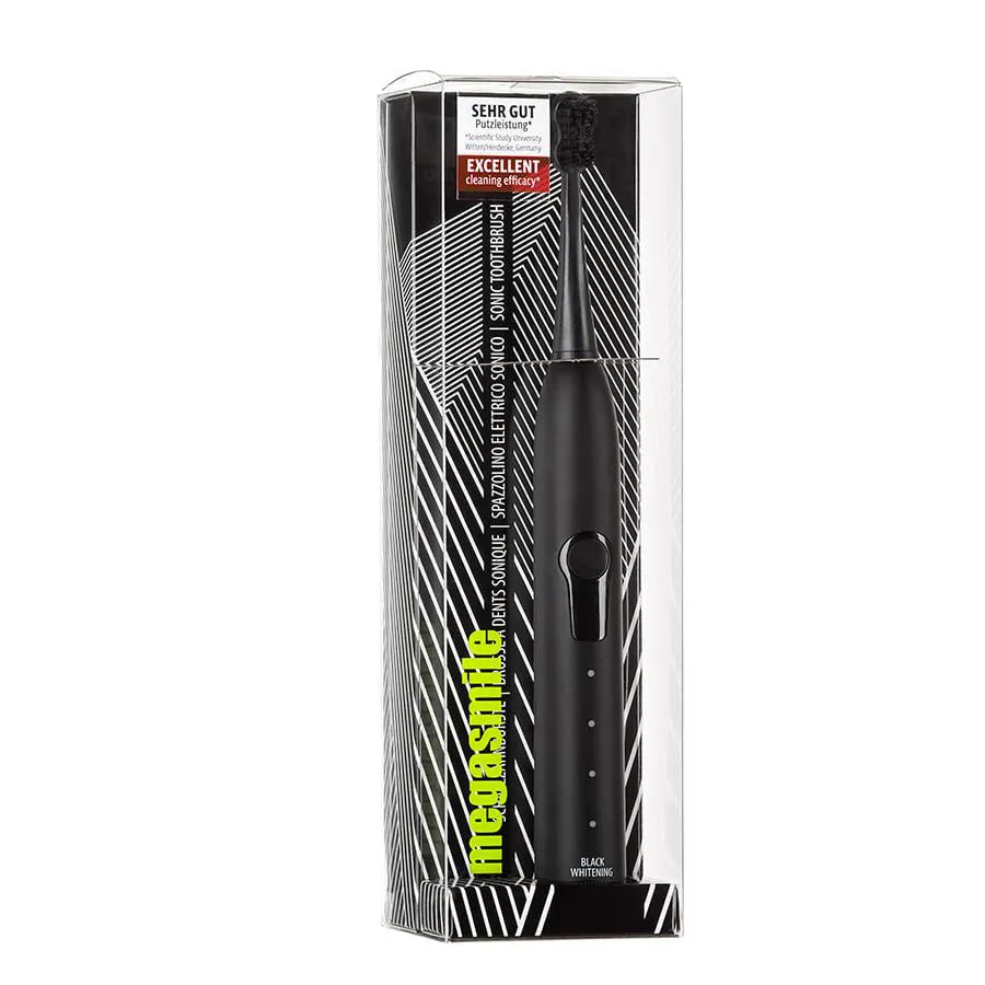 A escova de dentes Megasmile Sonic Black Whitening atua com base na combinação entre a tecnologia ACP e a tecnologia sônica. Até 42.000 movimentos sônicos por minuto criam um fluxo pulsante de fluídos que canalizam as ondas de energia diretamente nos menores nichos entre os dentes e intensifica a eficiência na escovação. As cerdas especiais com a tecnologia patenteada de micropartículas de carvão ativado promovem o branqueamento dos dentes. A Sonic Black Whitening também se destaca quanto ao seu design e sua cor viva. O design combina com a função.