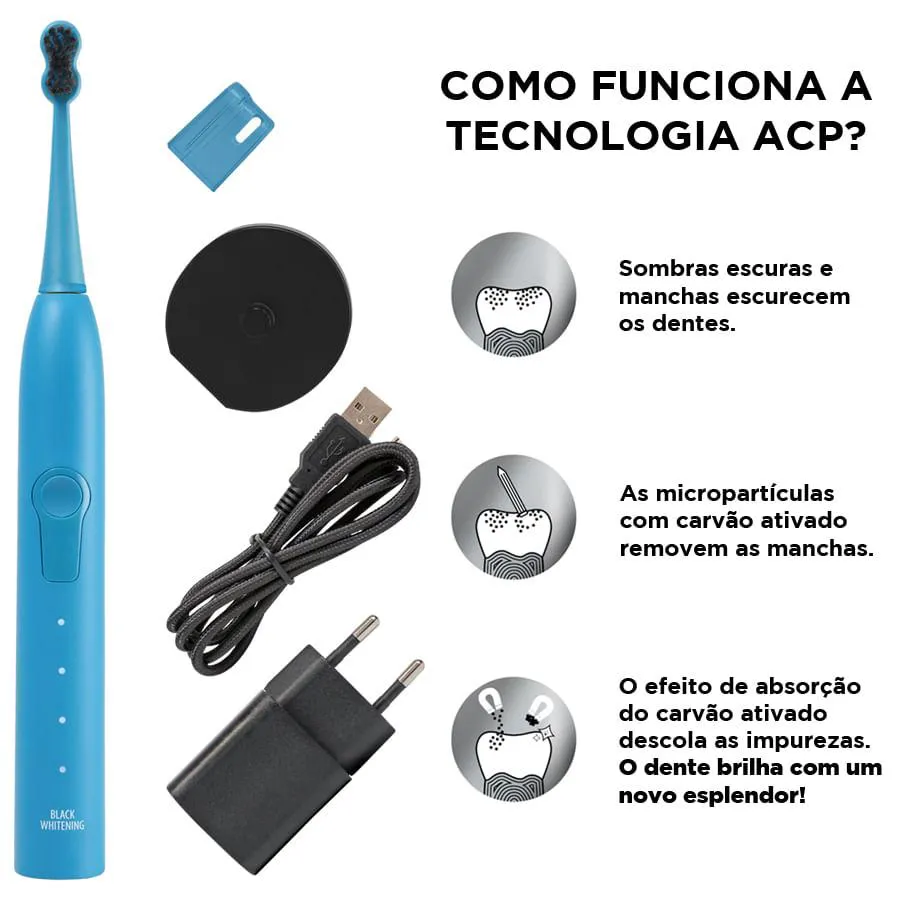 A escova de Dentes Megasmile Sonic Black Whitening atua com base na combinação entre a tecnologia ACP e a tecnologia sônica.