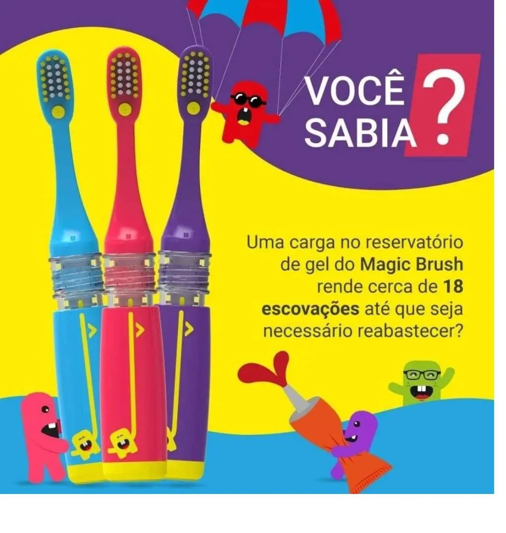 A escova dental infantil que funciona como mágicaA Magic Brush® é um produto inovador e diferente de qualquer escova de dente no mercado nacional. Além de todas as características próprias de uma escova de dentes infantil, ela ainda possibilita que seja usada a quantidade correta de creme dental em cada escovação, permitindo que a própria criança abasteça sua escova sem desperdício: é saúde e proteção na medida certa.A Magic Brush® é um produto inovador e diferente de qualquer escova de dente no mercado nacional. Além de todas as características próprias de uma escova de dentes infantil, ela ainda possibilita que seja usada a quantidade correta de creme dental em cada escovação, permitindo que a própria criança abasteça sua escova sem desperdício: é saúde e proteção na medida certa.