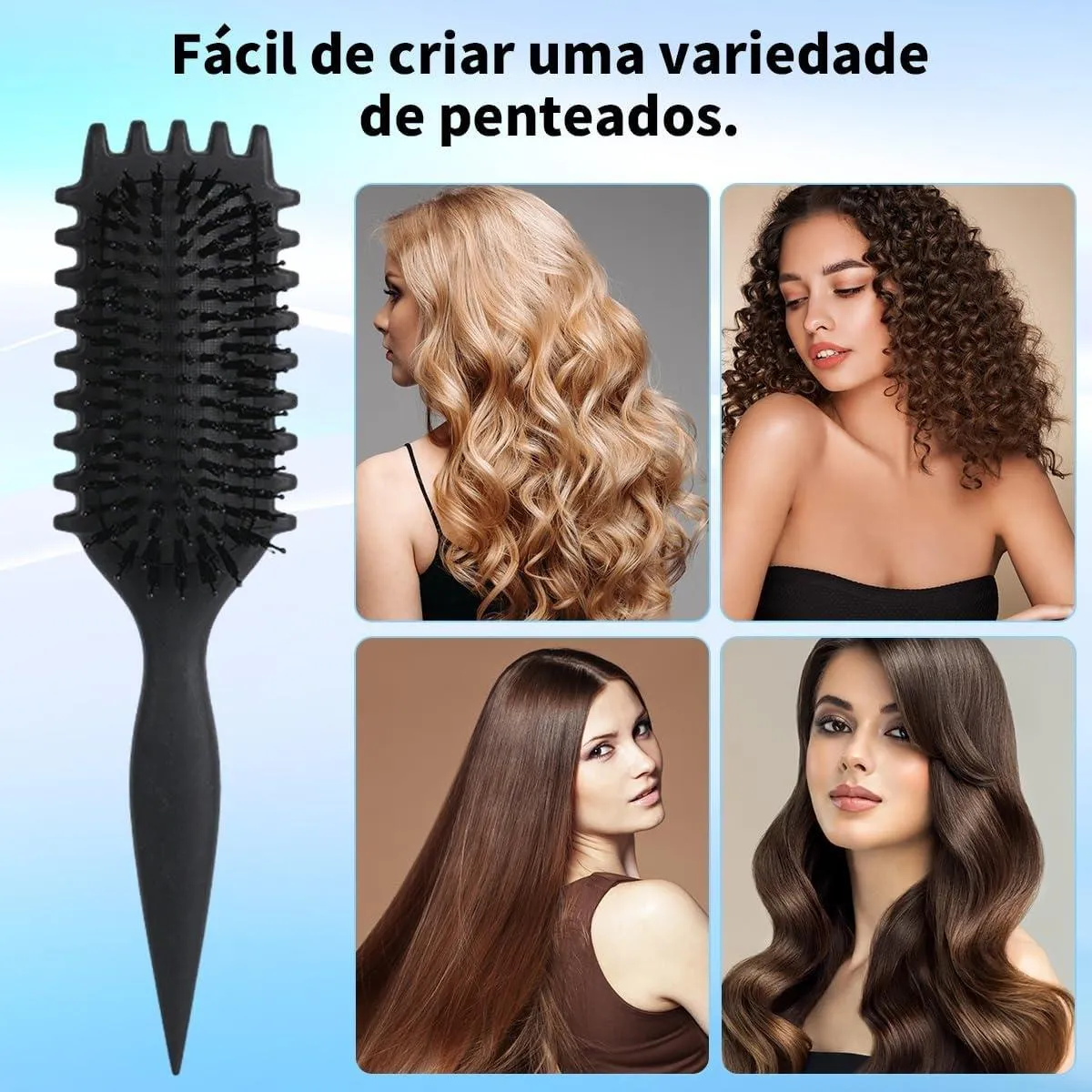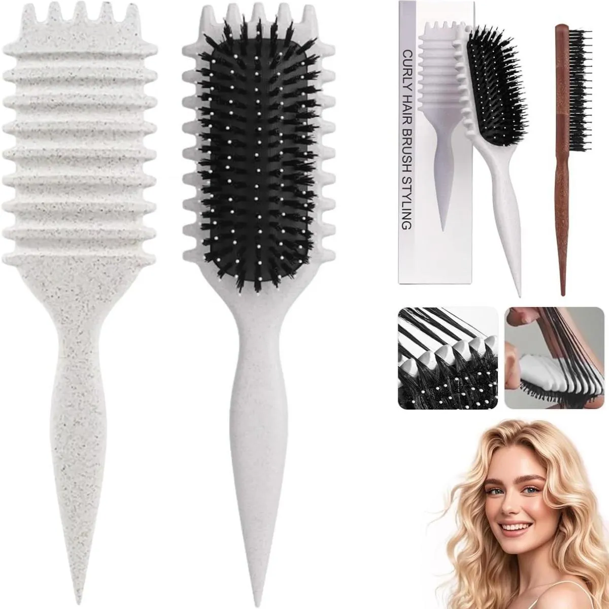 Escova definidora de cachos: Seu cabo ergonômico e cerdas estrategicamente colocadas definem, moldam e desembaraçam cachos sem esforço. Com um design especial de dentes que ajuda a dividir uniformemente o cabelo para uma experiência de estilo mais conveniente.