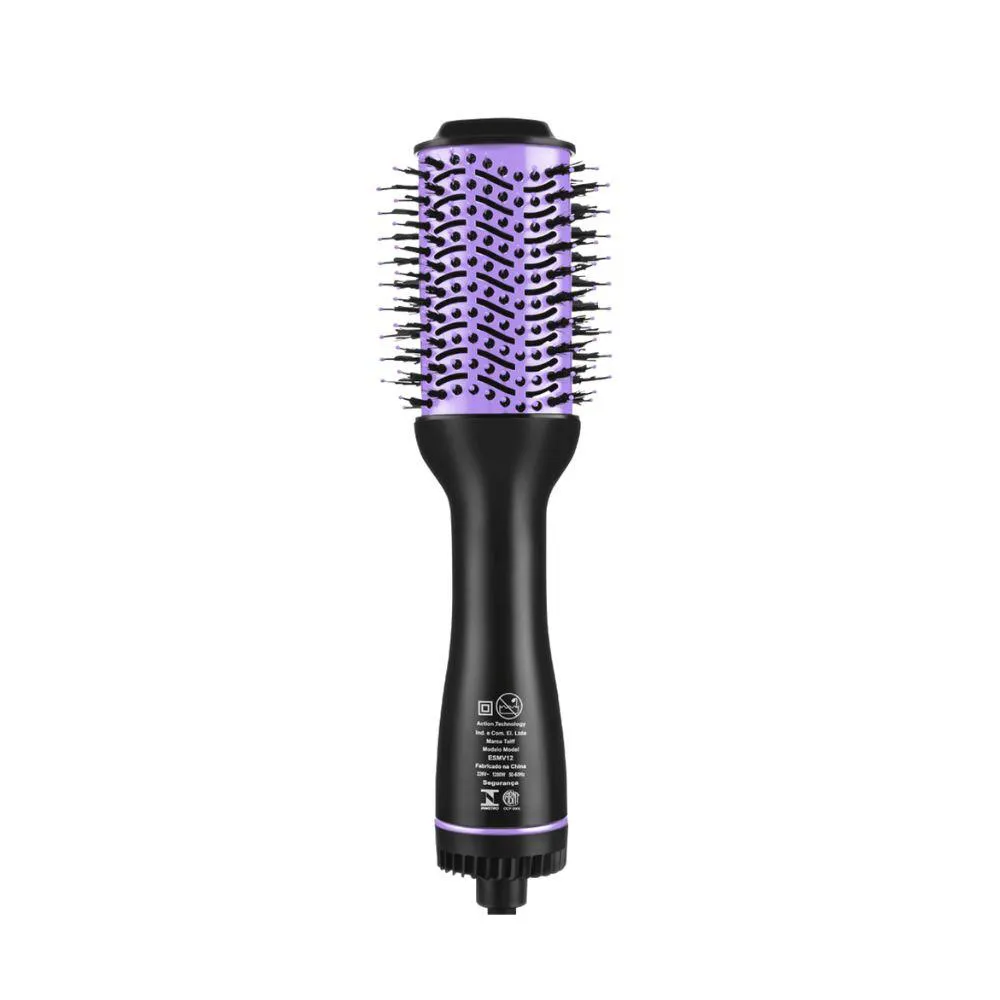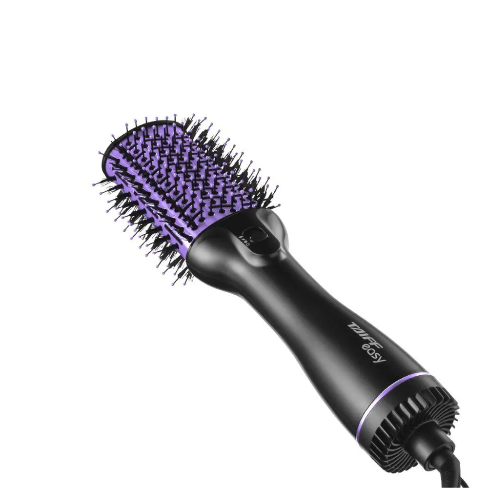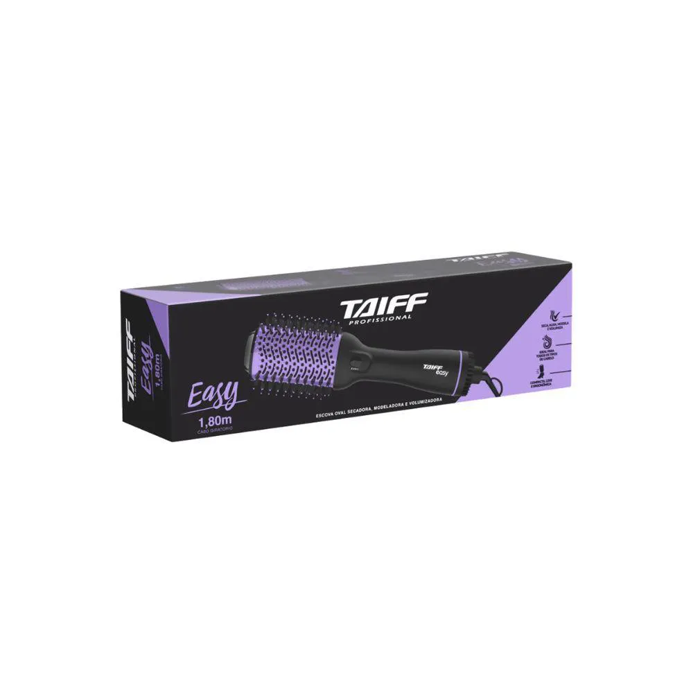 Deixe seus cabelos impecaveis com a escova Secadora Taiff Easy! Com ela, voce seca, alisa, modela e da volume aos fios com rapidez e praticidade. O modelo possui potencia de 1200W e 2 temperaturas, alem de ar frio, perfeito para finalizar seus penteados. Essa tecnologia ajuda a diminuir o frizz, selar as cuticulas e evitar o ressecamento dos cabelos, alem de proporcionar melhores resultados. A Escova Secadora Taiff possui cerdas de nylon de dupla altura, que confere uma melhor tracao, oferecendo um deslize mais suave e protegendo os fios, alem de deixa-los polidos e com um brilho radiante. Ja o revestimento metalico torna o processo de secagem mais rapido, proporcionando modelagens mais duradouras. Com regulagem de temperatura entre duas variacoes, tambem possui botao Jato de Ar Frio que diminui o frizz e a eletricidade estatica, eliminando o aspecto de cabelo arrepiado, selando as cuticulas do fio, preservando a umidade natural de sua estrutura, e evitando o ressecamento. Essa tecnologia tambem e ideal para fixar a modelagem do cabelo no momento da finalizacao, garantindo que ele permaneca lindo por muito mais tempo! Especificacoes Tecnicas Modelo: Easy Lilas Potencia: 1200W Comprimento do Fio: 1,80 m Voltagem: 110V 220V (nao e bivolt) Cor: Preto e Lilas Tipo: Escova Temperatura: 02 Outros Recursos: Seca, alisa e modela Com desempenho superior, a secagem e rapida e sua acao anti-frizz deixa os fios perfeitamente alinhados Recomendavel utilizar em cabelos umidos: Sim Garantia: 06 meses