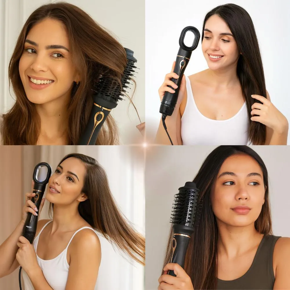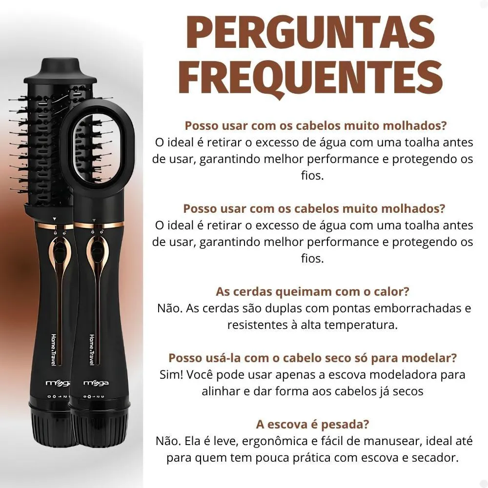 A única que entrega a verdadeira função 3 em 1: secador, direcionador de ar e escova modeladora.Desenvolvida com recomendações de profissionais para garantir a máxima eficiência e cuidado com os fios.Possui cerdas duplas especiais com pontas emborrachadas, resistentes ao calor, para um desembaraço suave e modelagem eficaz.Revestimento da escova em cerâmica que elimina o frizz e proporciona um brilho intenso aos cabelos.Extremamente silenciosa, com apenas 82db, garantindo uma experiência mais agradável.Produto certificado pelo Inmetro, assegurando segurança e qualidade.Design desmontável e compacto, ideal para transporte e armazenamento, tornando-a perfeita para viagens.Ocasiões de Uso e Cenários Ideais