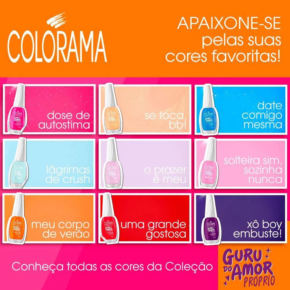 A linha Guru do Amor Próprio possui dez cores incríveis e traz em seu conceito a importância de se amar e se valorizar. A coleção fará com que você solte suas cores com a confiança e qualidade que os produtos Colorama possui.