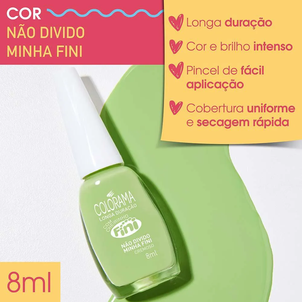 A Coleção "Fini" possui dez cores incríveis e um cheirinho inesquecível, cada esmalte é baseado na cor e aroma de alguma bala Fini. A coleção fará com que você solte suas cores com a confiança e qualidade que os produtos Colorama possui.