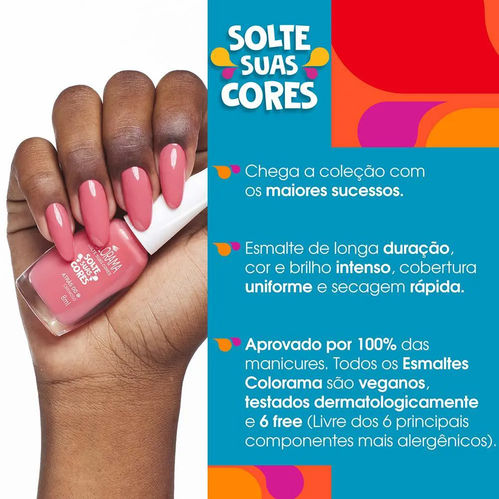 A coleção resgata os esmaltes que fizeram mais sucesso das coleções anteriores para ficar permanente na linha de produtos ativos da merca. A coleção fará com que você solte suas cores com a confiança e qualidade que os produtos Colorama possui. Todos os Esmaltes Colorama possuem longa duração, cor e brilho intenso.