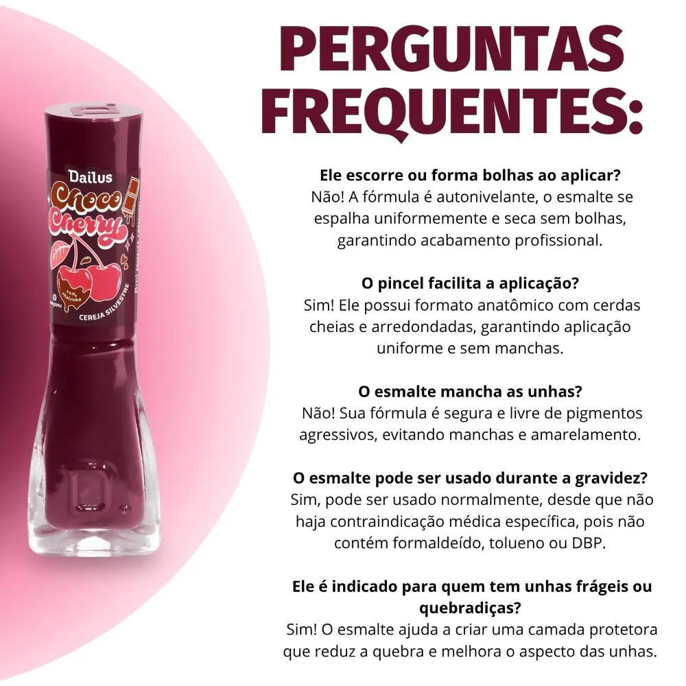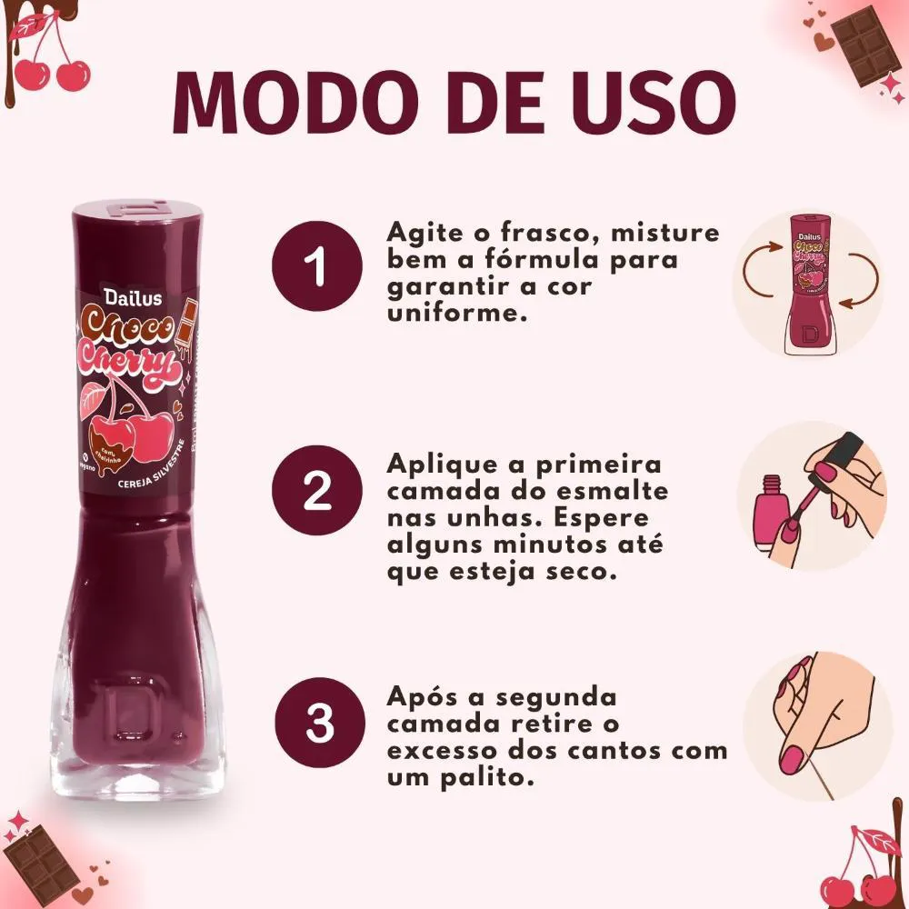 O Esmalte Cremoso Dailus Choco Cherry Cereja Silvestre é perfeito para todas as ocasiões, desde o uso diário, adicionando um toque de elegância discreta ao seu visual de trabalho, até eventos especiais que exigem um destaque maior, como festas e jantares. Sua cor intensa e acabamento cremoso são ideais para quem busca sofisticação e durabilidade em qualquer cenário, seja para um encontro casual ou uma celebração importante.Modo de Uso/Aplicação