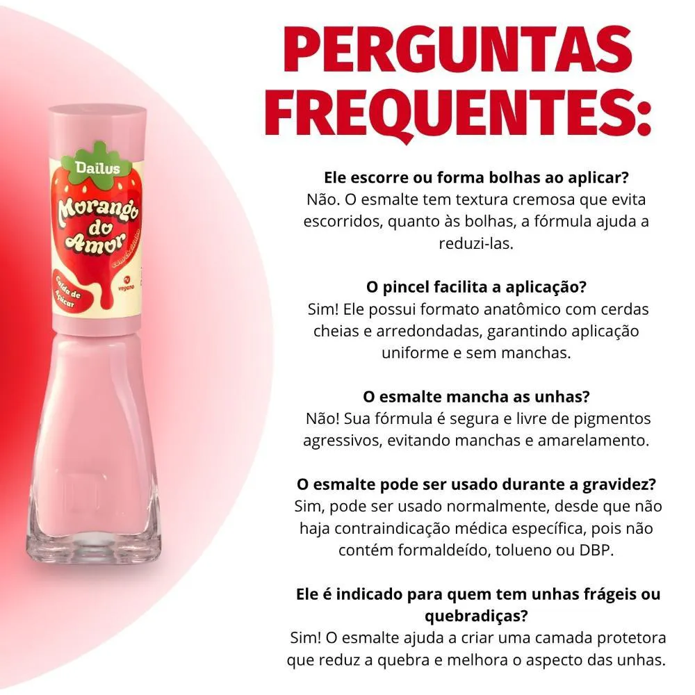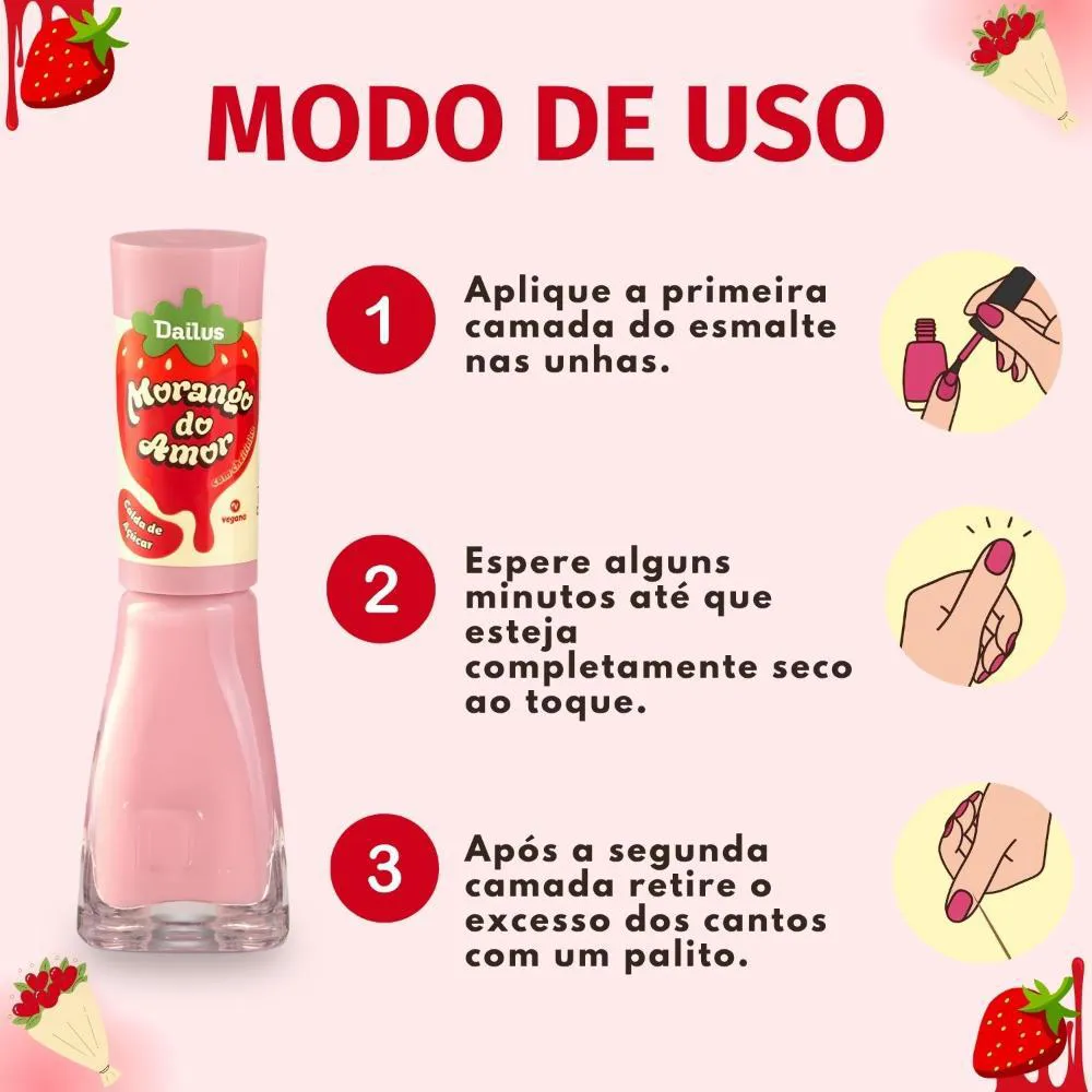 - Em seguida, aplique uma ou duas camadas do Esmalte Cremoso Dailus Morango Do Amor, conforme a intensidade de cor desejada.