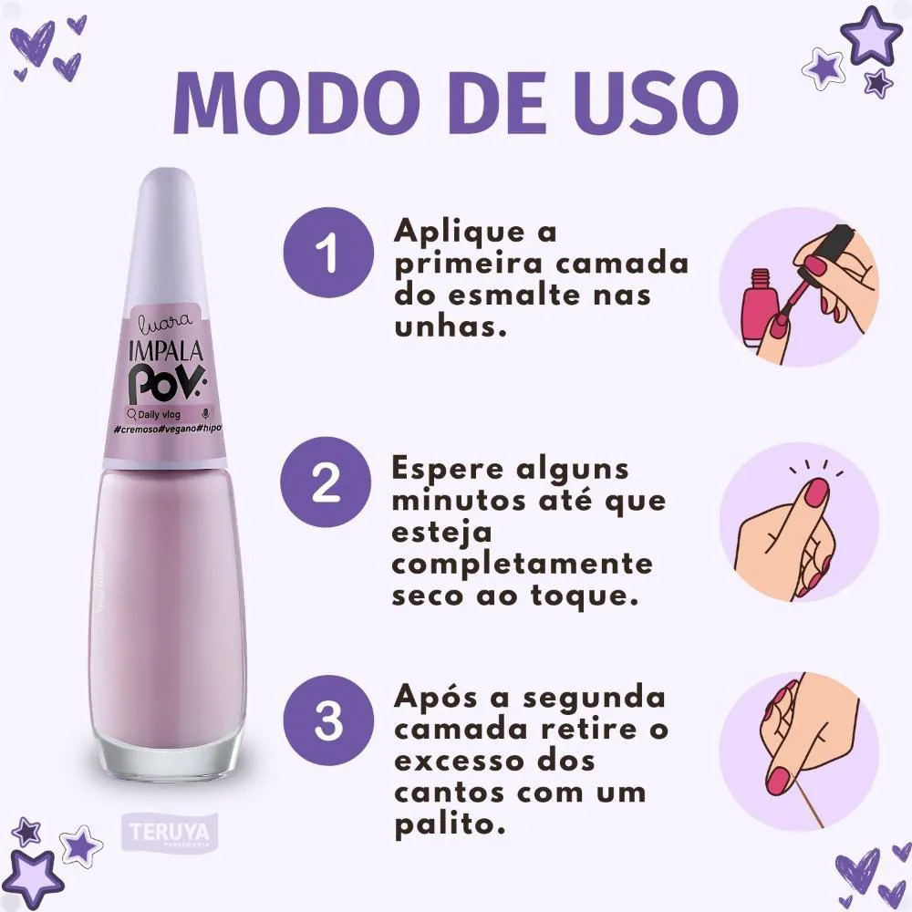 Para obter o melhor resultado com seu Esmalte Cremoso Impala Pov Daily Vlog, siga as instruções: Com as unhas limpas, aplique uma gota de esmalte na