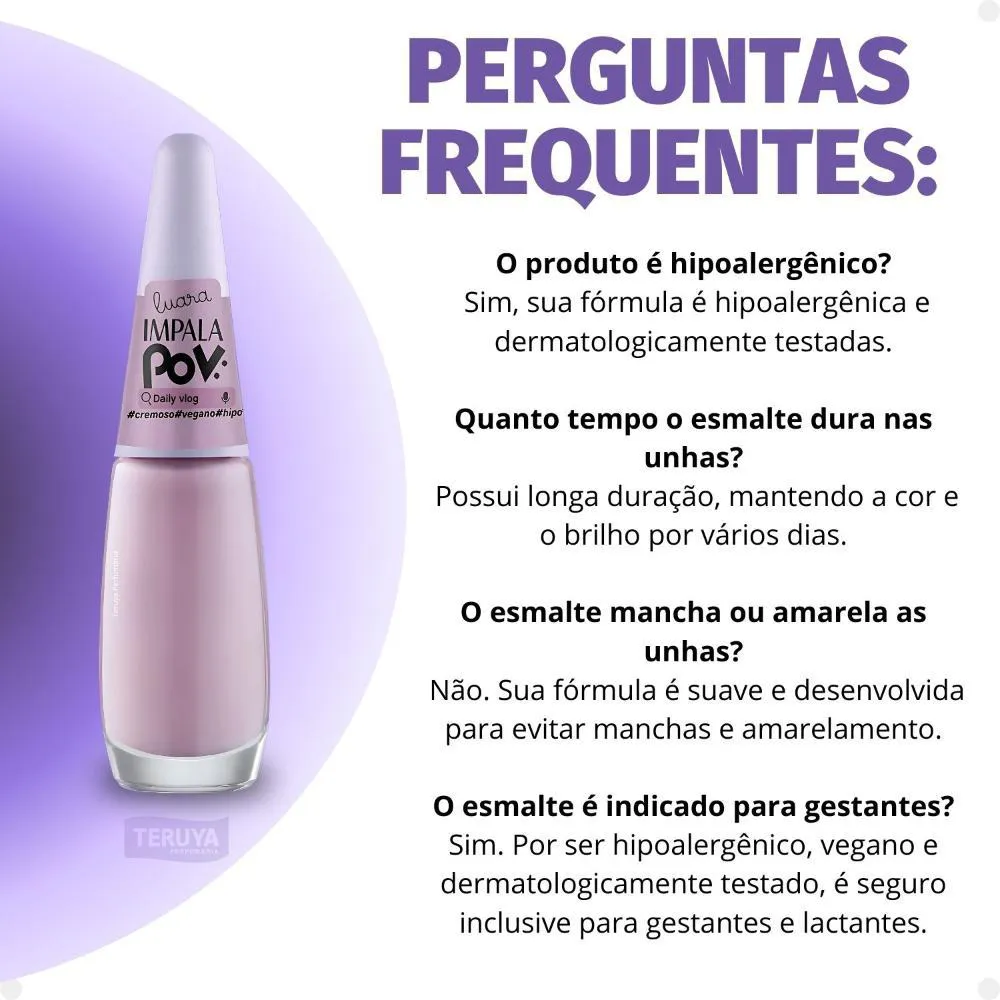 O Esmalte Cremoso Impala Pov Daily Vlog se destaca no mercado por suas características exclusivas: Produto hipoalergênico, ideal para peles sensíveis. Fórmula vegana e cruelty-free, não testado em animais. Dermatologicamente testado, garantindo segurança e qualidade. Parte da coleção POV da Impala, com a cor exclusiva Daily Vlog.