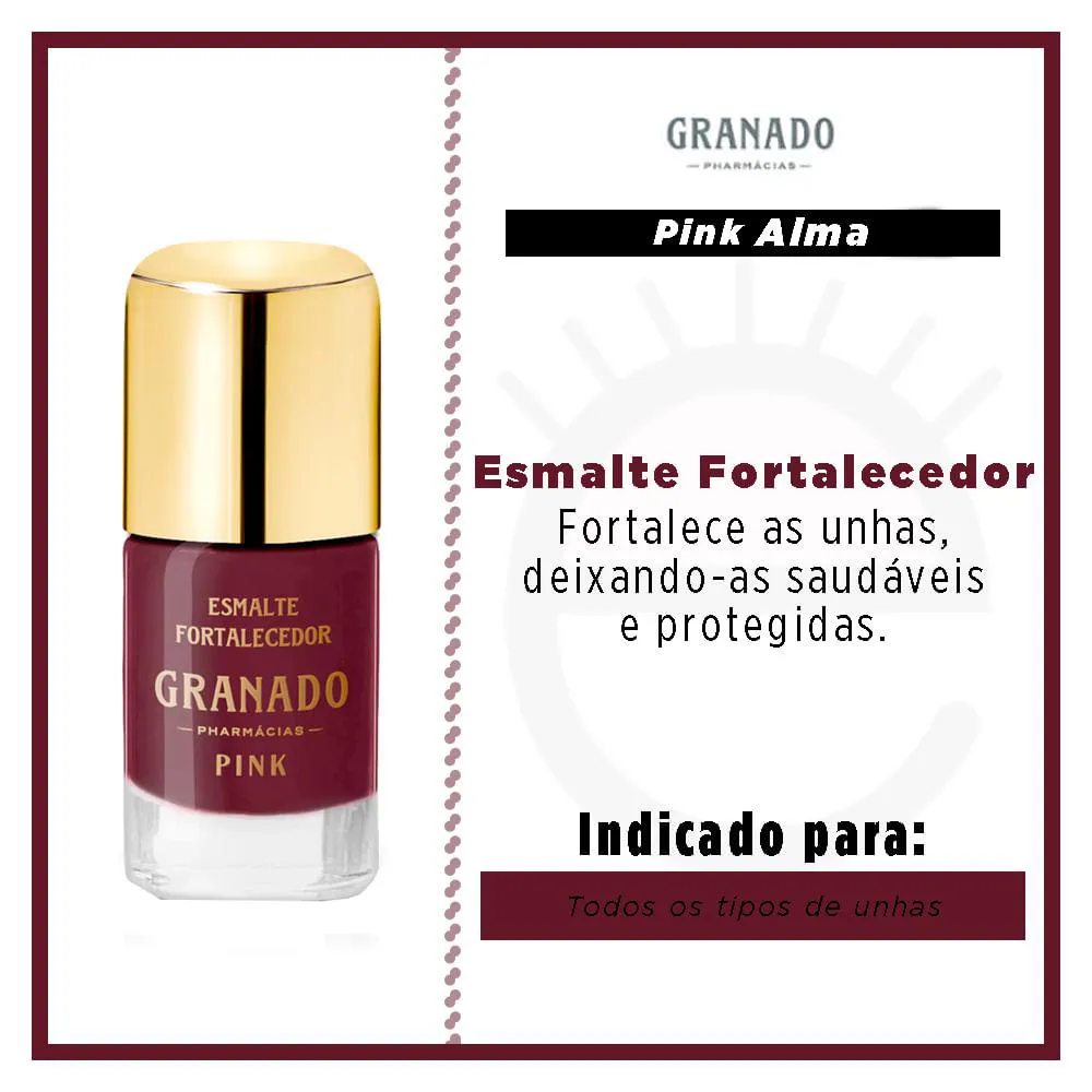 O Esmalte Fortalecedor Pink de Granado é enriquecido com vitamina e, cálcio e proteína da seda, fortalece as unhas, deixando-as saudáveis e protegidas, evitando assim a quebra e descamação. Não contém tolueno, parabenos, formaldeído, cânfora e DBP, ingredientes que podem causar alergia e o ressecamento das unhas. Produto de alta cobertura com brilho extra e secagem rápida.