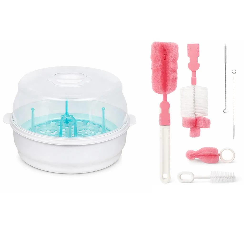 O produto é um conjunto composto por um esterilizador a vapor para micro-ondas e uma escova para limpeza de mamadeiras, destinado à higienização completa de utensílios infantis. Serve para esterilizar mamadeiras, chupetas e acessórios, eliminando 99,9% dos germes e bactérias de forma rápida e eficaz, com tempo de esterilização entre 2 a 6 minutos, mantendo os itens esterilizados por até 24 horas.