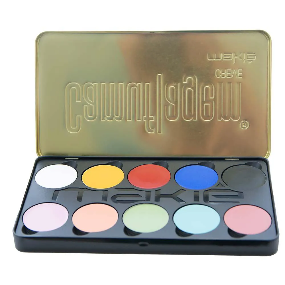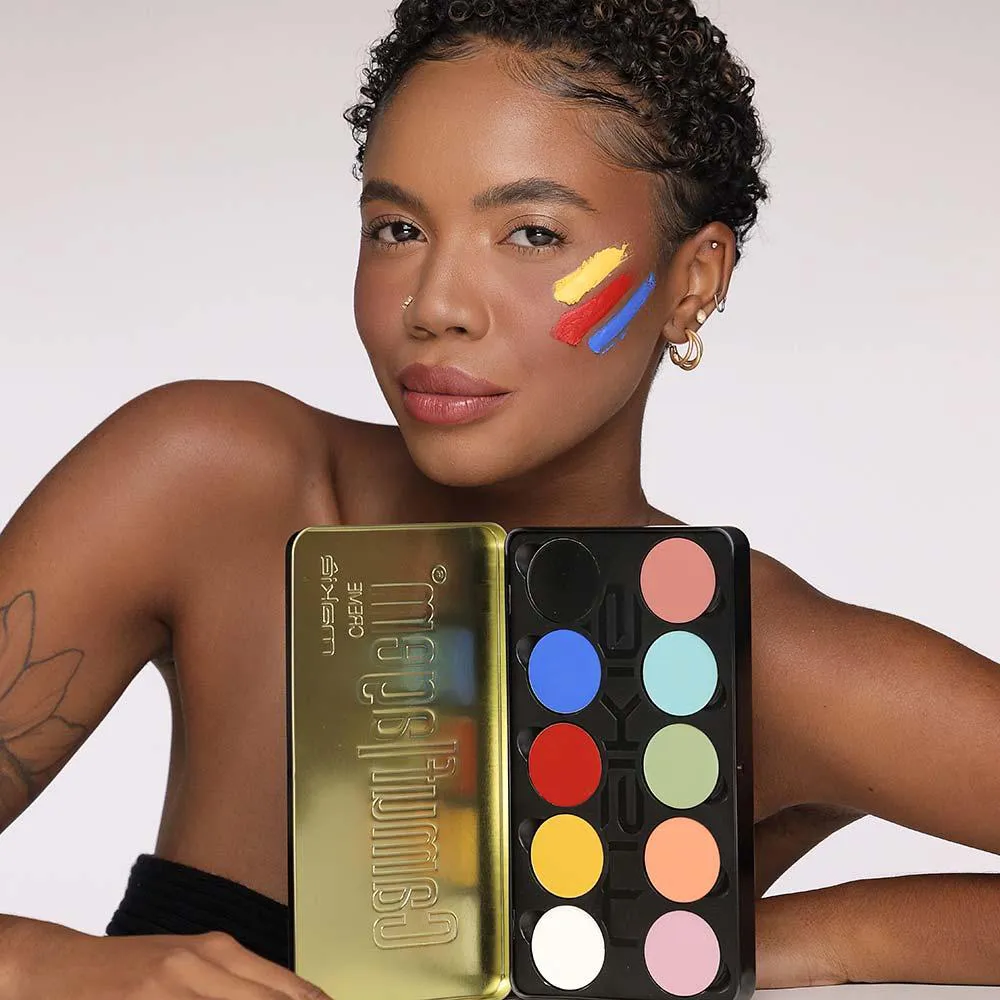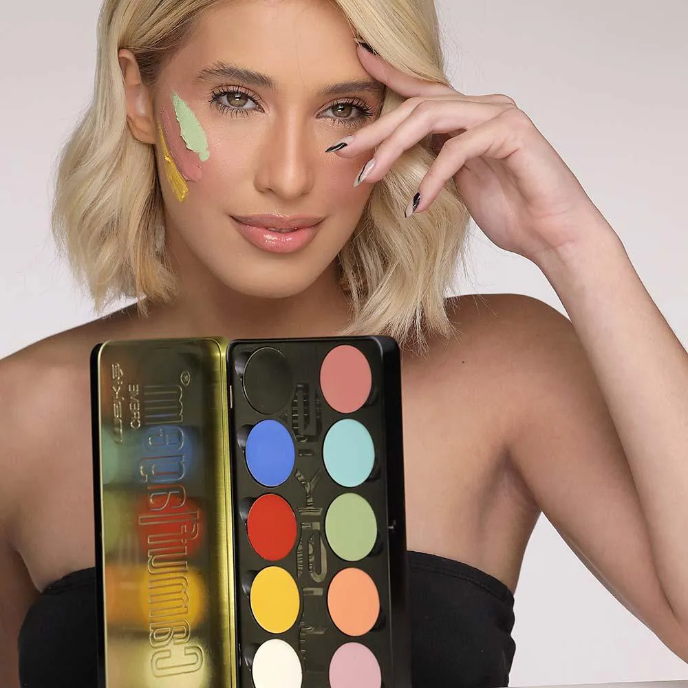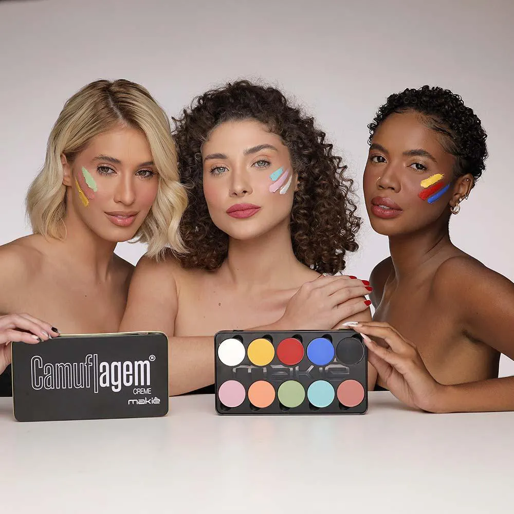 O Estojo Camuflagem Mapa das Cores Makiê traz para você uma linda lata com 10 cores de mini camuflagem, para colorimetria profissional. A experiência final é poder personalizar facilmente qualquer cor que você quiser para corrigir, ocultar, contornar ou criar maquiagem de fantasia.