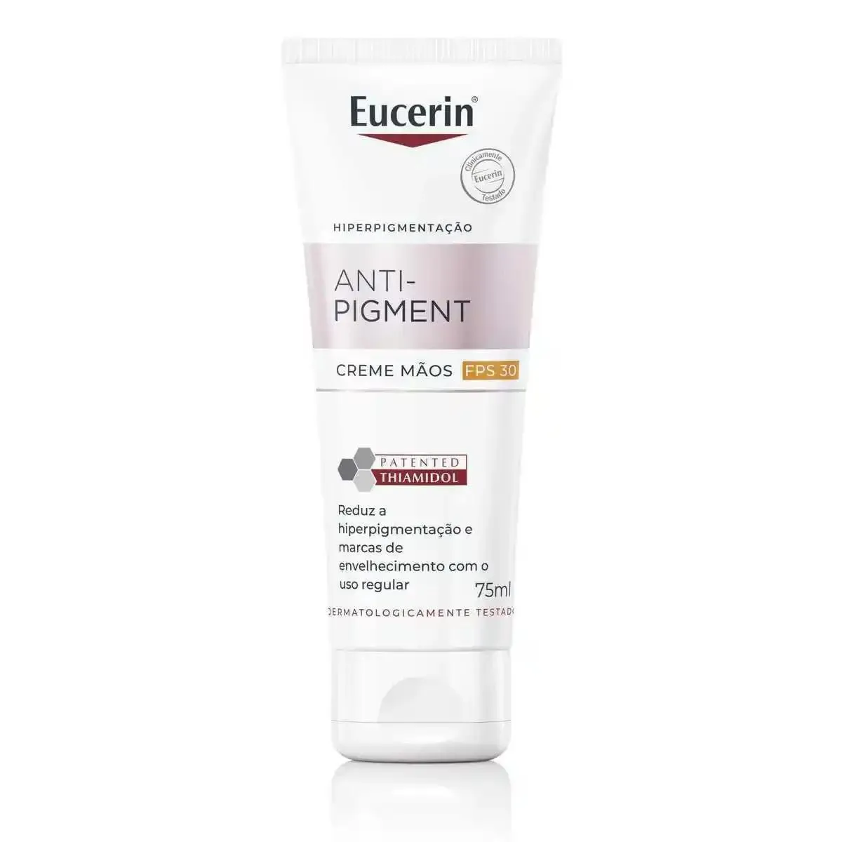 O Eucerin Anti Pigment Creme Clareador Para Mãos é um produto cosmético desenvolvido para tratar e melhorar a aparência da pele das mãos. Ele contém o ativo Thiamidol, que atua diretamente na redução da hiperpigmentação e sinais de envelhecimento, proporcionando uma pele mais uniforme e radiante. Com proteção solar FPS 30, o creme hidrata intensamente, melhora a elasticidade e firmeza da pele, sendo indicado para todos os tipos de pele.