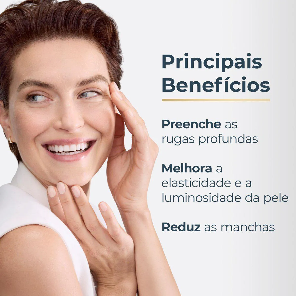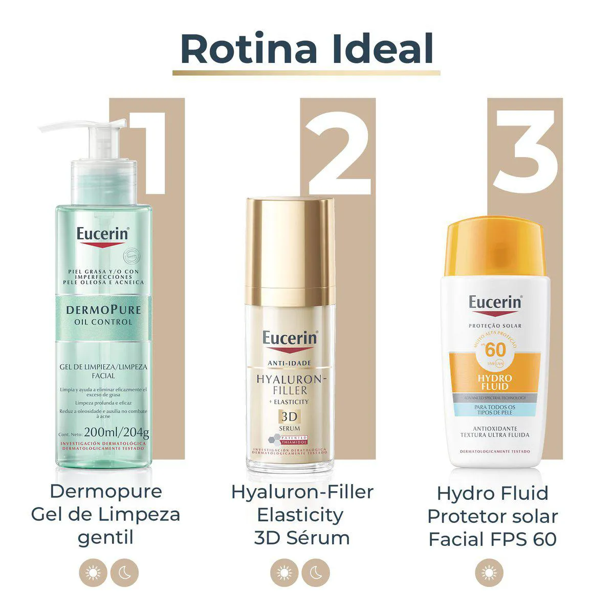 O Sérum Facial antirrugas Eucerin Hyaluron-Filler Elasticity 3D age intensamente na redução de rugas, controle de flacidez e hiperpigmentação. Cuidadosamente formulado com uma combinação de Ácido Hialurônico, Thiamidol patenteado Eucerin e Arctiin, ele proporciona redução das rugas profundas, melhora na densidade e volume da pele, aumenta o colágeno e diminui as manchas de idade.
