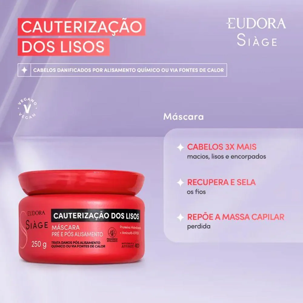 A Eudora Siàge Cauterização dos Lisos Máscara Pré e Pós Alisamento é um tratamento capilar intensivo que garante cabelos 3x mais macios, lisos e recuperados. Desenvolvida com Amino10-effex, um blend exclusivo de 10 aminoácidos, e Proteína Hidrolisada, ela fortalece as fibras capilares, repõe nutrientes e sela a fibra desde o córtex, reduzindo o afinamento das pontas. Ideal para cabelos lisos naturais ou alisados por processos químicos ou calor (secador/chapinha), esta máscara recarrega a massa perdida, protege contra danos futuros e oferece uma fragrância duradoura que resiste ao calor. Com a tecnologia Affinité 4D, proporciona cauterização imediata e resultados de salão em casa.