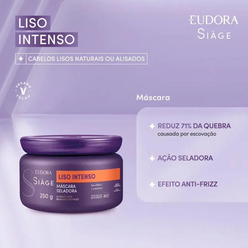 A Eudora Siàge Liso Intenso Máscara Capilar é ideal para quem deseja cabelos lisos, hidratados e sem frizz por mais tempo. Com sua inovadora, promove alinhamento duradouro e brilho extremo, sem abrir mão da leveza e do movimento natural dos fios.
