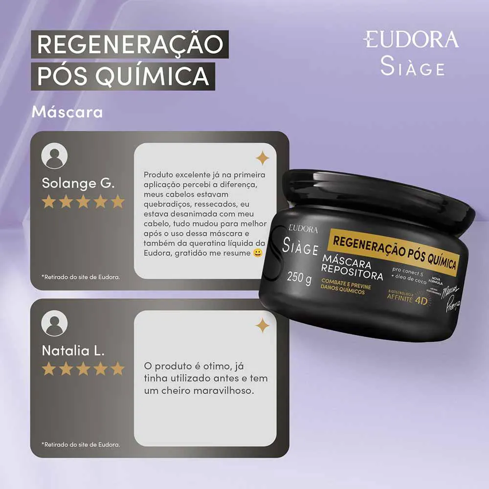 A Máscara Capilar Regeneração Pós Química promove regeneração completa: cutículas reparadas e cabelos 3x mais resistentes já na 1ª aplicação.