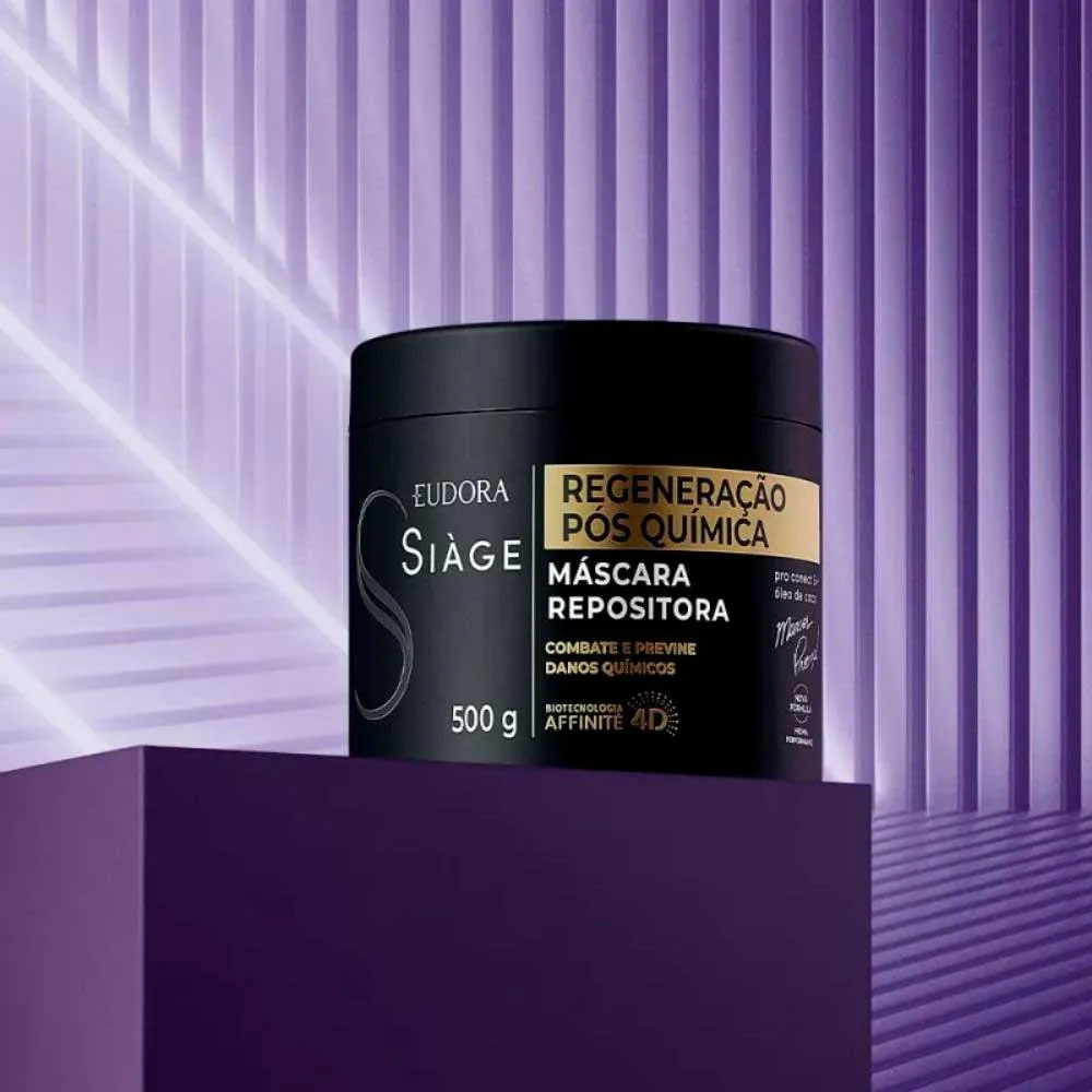 Siàge Regeneração Pós Química, assinada pelo expert Marcos Proença, traz o complexo tecnológico Pro Conect 5 + óleo de coco que promove o religamento das pontes capilares dos fios ressecados e quebrados por agressões químicas.