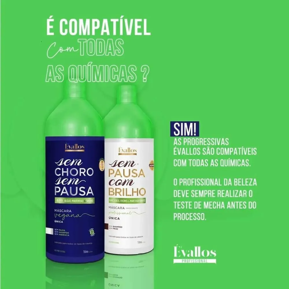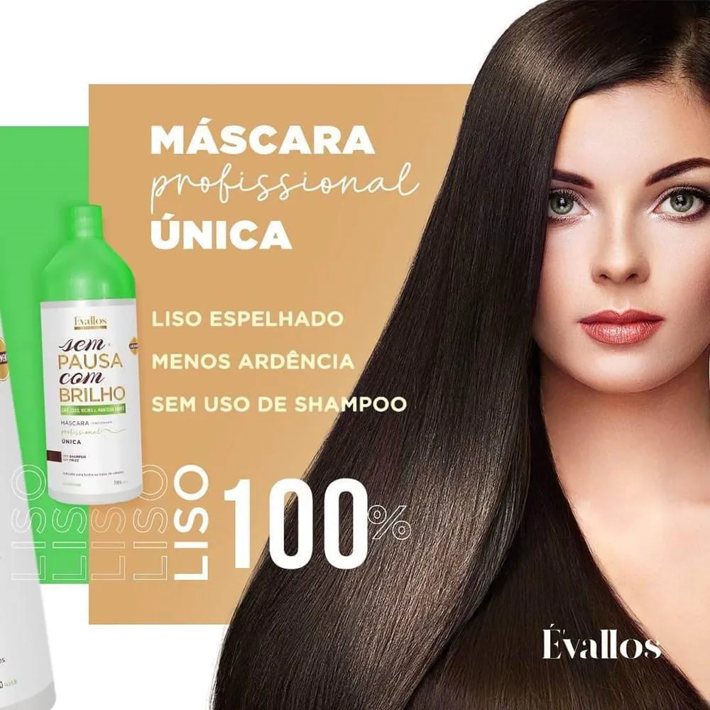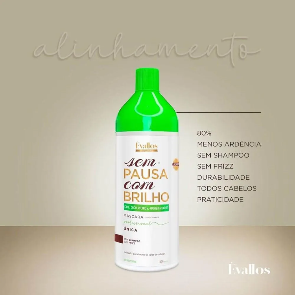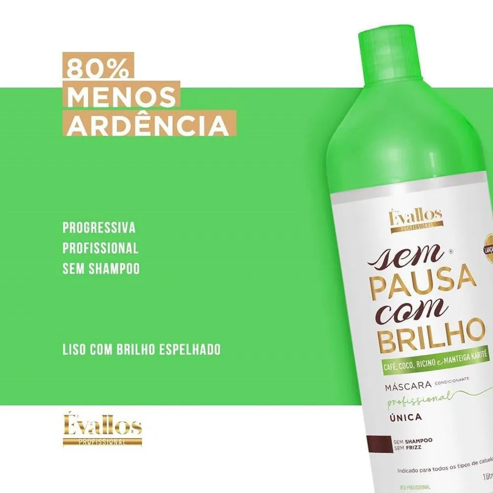 Évallos Profissional Progressiva Sem Pausa com Brilho 1000ml Evallos Profissional traz mais esse lançamento escova progressiva tradicional com seu diferencial em não precisar lavar os cabelos com shampoo antiresíduos, resultando em mais rapidez e praticidade com um resultado 100% liso. Com a Evallos Sem Pausa com Brilho você tem praticidade, rapidez nos processos de alisamento e o melhor de tudo não precisa abrir as cutículas. Alinha 100% os fios, sem o uso de Shampoo com 80% menos Ardência. Conselho de Aplicação: Agite Bem Antes De Usar.