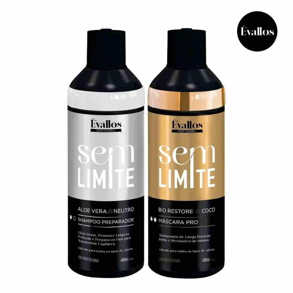 Évallos Profissional shampoo Antiresiduo Detox + Máscara Progressiva Sem Limite 2x400ml A Máscara Pro Sem Limite promove alinhamento em todos os tipos de cabelos, com efeito de longa duração restaura a fibra capilar. Formulação Bio Restore e Coco O Shampoo Preparador Sem Limite foi desenvolvido para promover uma limpeza profunda dos fios com efeito detox, e antiresíduos preparando os fios para receber tratamentos profissionais. Formulação com Aloe Vera. Neutro. Alinhamento Orgânico, Longa Duração, Reconstrução Intensa dos Fios, Maciez e Leveza. Conselho de Aplicação: Com os cabelos molhados, aplique uma quantidade suficiente de Shampoo Preparador Friccionando no sentido contrário por toda a extensão dos fios. Enxágue abundantemente, observando se houve abertura de cutículas, se necessário, repita o processo.