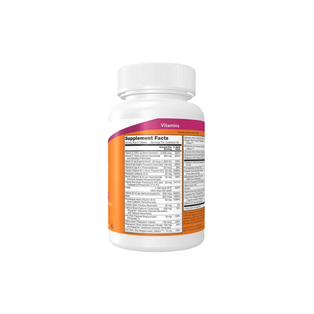 Os comprimidos NOW EVE™ são especialmente formulados para as necessidades vitamínicas de mulheres adultas, apresentando cranberry, ácido alfa lipoico, CoQ10, superfrutas e muito mais. Esta fórmula exclusiva tem 100% do valor diário recomendado de ferro, usando Ferrochel™, uma forma de ferro não constipante. Pode ocorrer variação natural da cor deste produto.