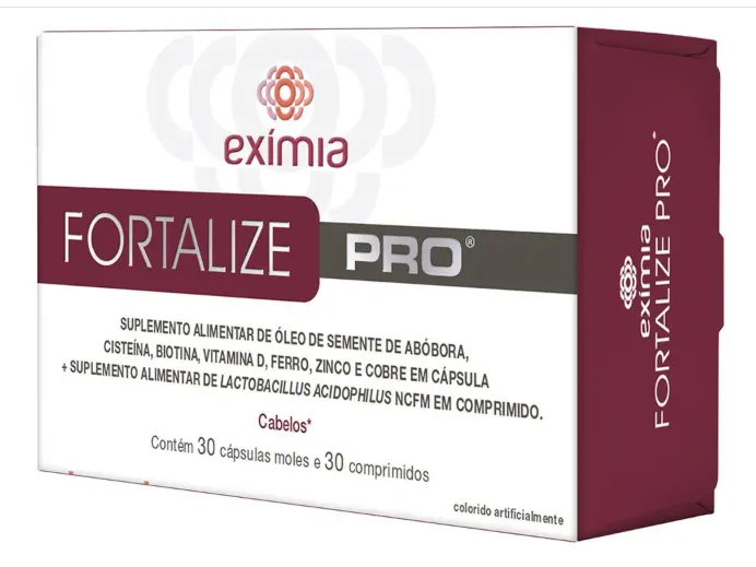 Eximia Fortalize Pro é um suplemento alimentar que auxilia na saúde dos cabelos. Formulado com uma associação exclusiva e inovadora com óleo de semente de abóbora, probiótico, cisteína, vitamina d, biotina, ferro e zinco somados a outras vitaminas e minerais, que juntos, auxiliam no cuidado da queda capilar com afinamento dos fios e cabelos mais ralos, sendo associado ou não a dermatite seborreica (caspa), com segurança de uso.