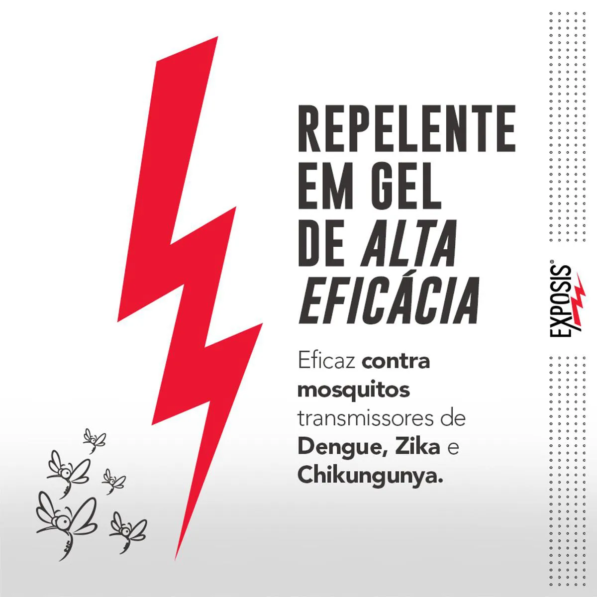 É indicado para usar na pele, como proteção contra picadas de insetos, como o Aedes Aegypti e Aedes Albopictus (transmissores da dengue, febre amarela, chikungunya e Zika vírus), o Anófeles (transmissor da malária), o Culex (transmissor da filariose), além de pernilongos e outros mosquitos. Exposis Gel é a opção ideal para você curtir um fim de semana na natureza, ou praticar atividade física ao ar livre. Sem perfume e hipoalergênico (formulado para minimizar o possível surgimento de alergia).