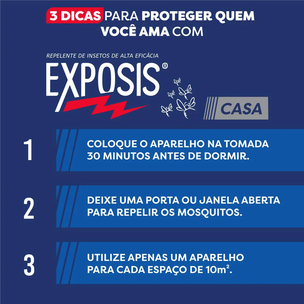 Exposis Casa Repelente Elétrico oferece proteção contra os mosquitos por até 30 noites, quando usado durante 8 horas por noite. Ele pode ser usado em áreas com crianças a partir dos 06 meses de idade.