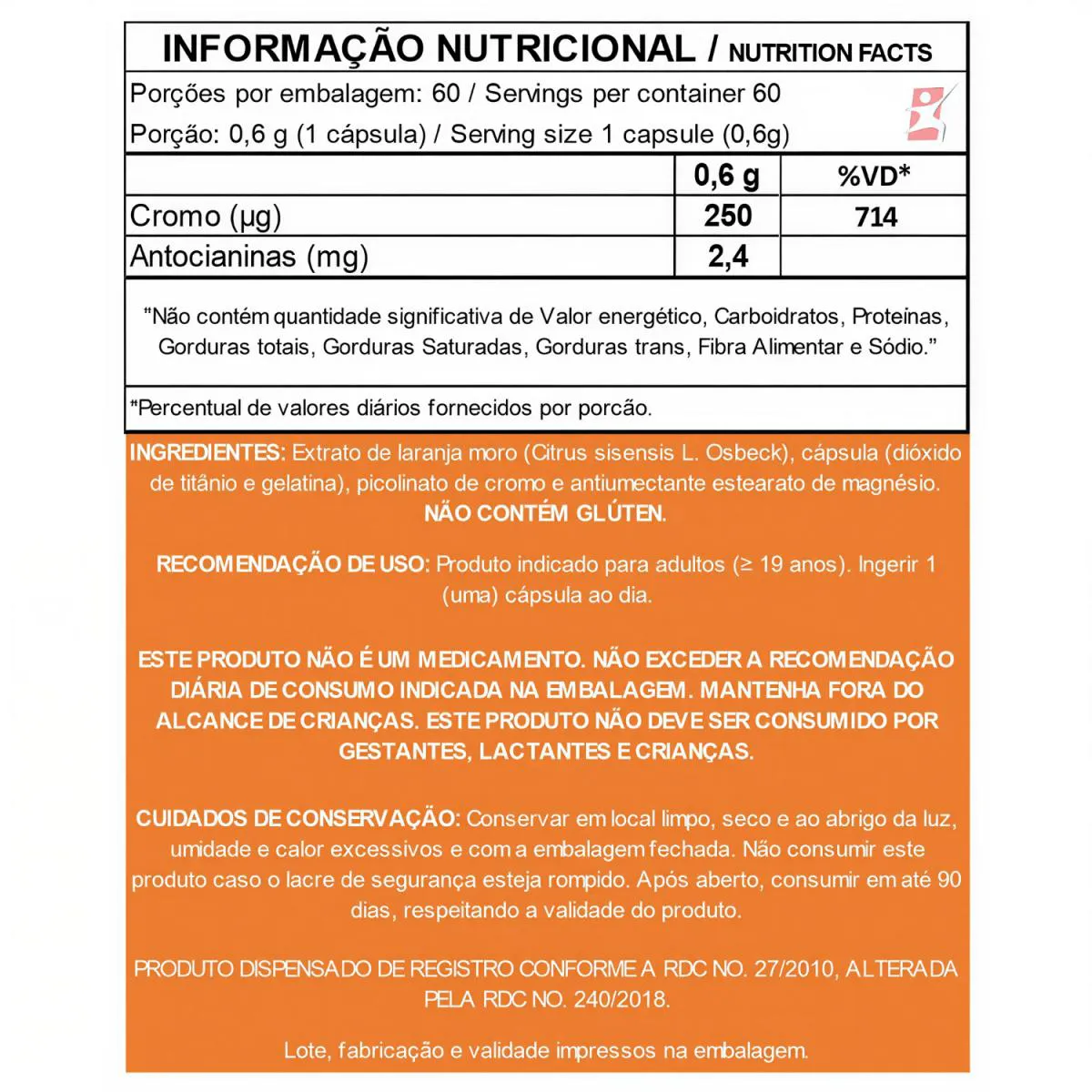 LARANJA MORO 500MG + PICOLINATO DE CROMO 250MCG APENAS 1 CÁPSULA AO DIA – TAKE CARE DESCRIÇÃO A Laranja Moro é um suplemento em cápsulas, também conhecida como “Laranja de Sangue” ou “Laranja Vermelha”, é um tipo de laranja comum na Itália, com alto teor de antocianinas, polifenóis, vitamina c e carotenoides. Diversos estudos científicos já encontraram evidências sobre os efeitos positivos do seu extrato para a saúde. BENEFÍCIOS - Fonte de antocianinas; - 2,4mg de antocianinas por cápsula; - 500mg de extrato de Laranja Moro por cápsula; - Com Picolinato de Cromo; - Apenas 1 cápsula ao dia; - SEM: GLÚTEN, LACTOSE E AÇÚCAR. SUGESTÃO DE USO Produto indicado para adultos ≥ 19 anos. Ingerir 1 (uma) cápsula ao dia. TABELA NUTRICIONAL – COMPOSIÇÃO – RECOMENDAÇÕES Anexo nas imagens. DADOS TÉCNICOS Registro ANVISA – PRODUTO ISENTO DE REGISTRO CONFORME 240/2018. Marca – TAKE CARE. Conteúdo líquido por frasco – 60 cápsulas. Rendimento líquido por frasco – 60 doses/porções. Peso líquido por frasco – 36g. Peso bruto por frasco – 65g. Peso aproximado do produto + embalagem de envio – 150g. Código de barras (EAN) – 7898671434285. Dimensões do produto – altura 11 cm; largura 6 cm; comprimento 6 cm. Dimensões da embalagem padrão – altura 7 cm; largura 13 cm; comprimento 16cm. ITENS DO ANÚNCIO - 1 Unidade do produto: LARANJA MORO 500MG + PICOLINATO DE CROMO 250MCG APENAS 1 CÁPSULA AO DIA – TAKE CARE. Total: 60 cápsulas POR FRASCO.