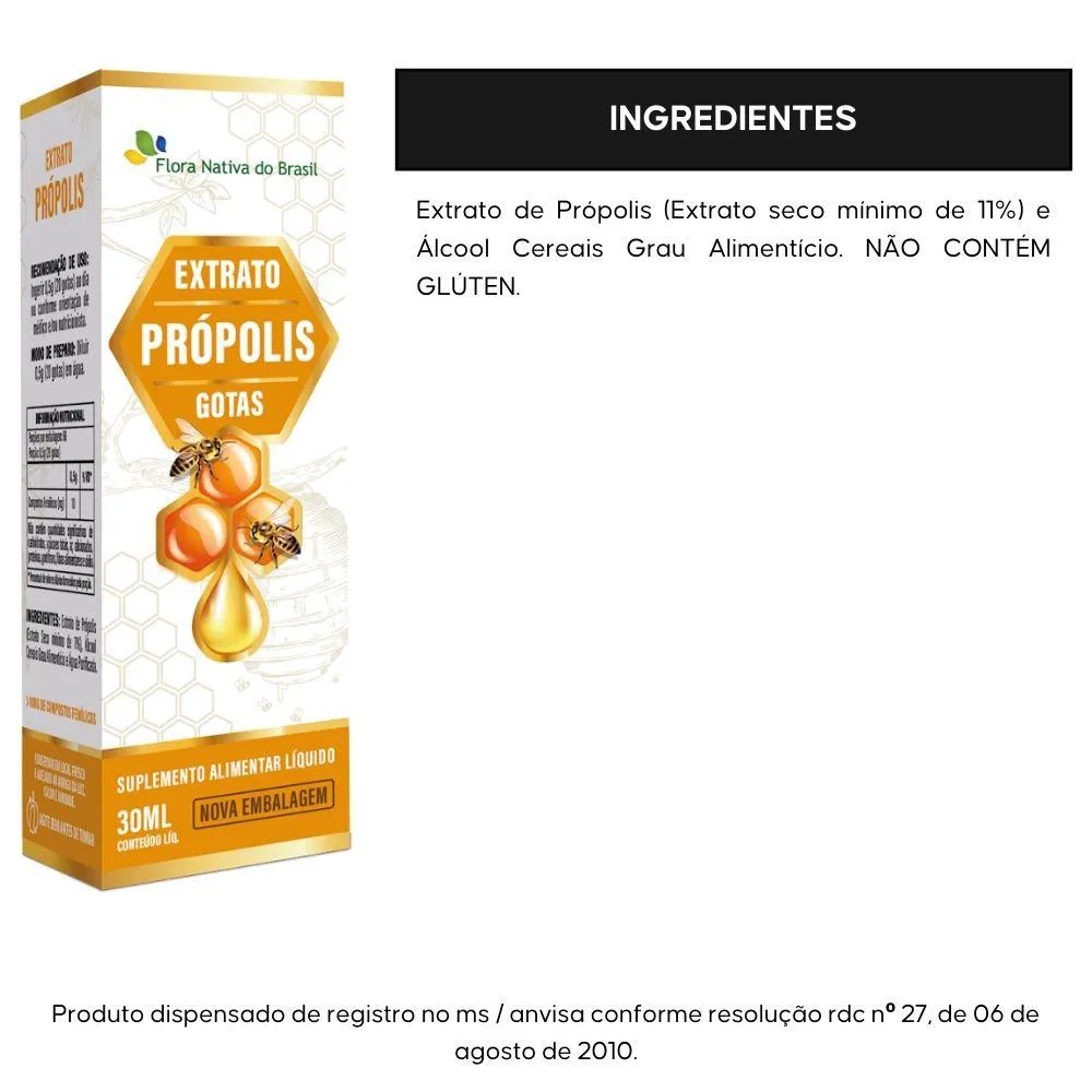 Extrato de Própolis (Extrato seco mínimo de 11%) e Álcool cereais Grau Alimentício. NÃO CONTÉM GLÚTEN.