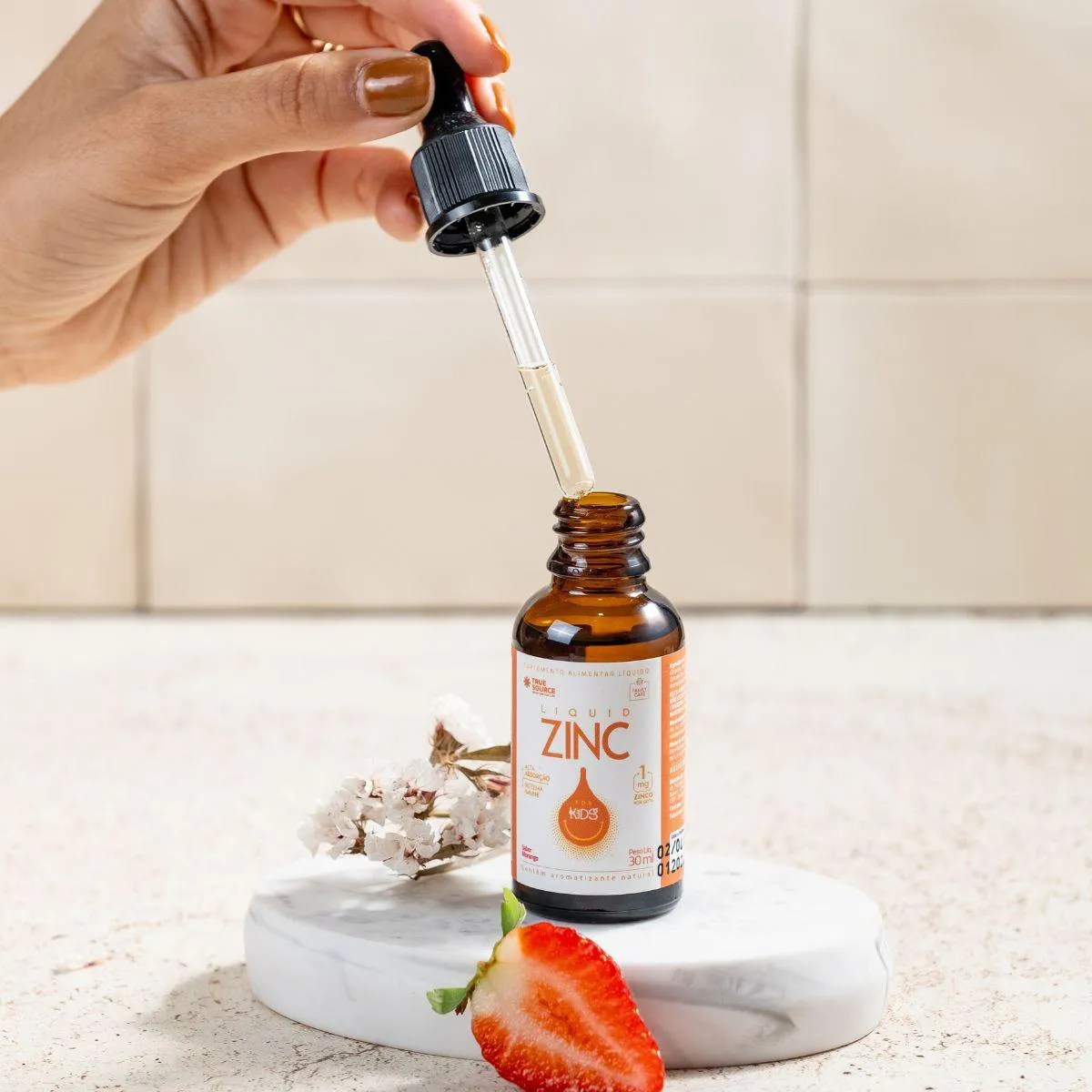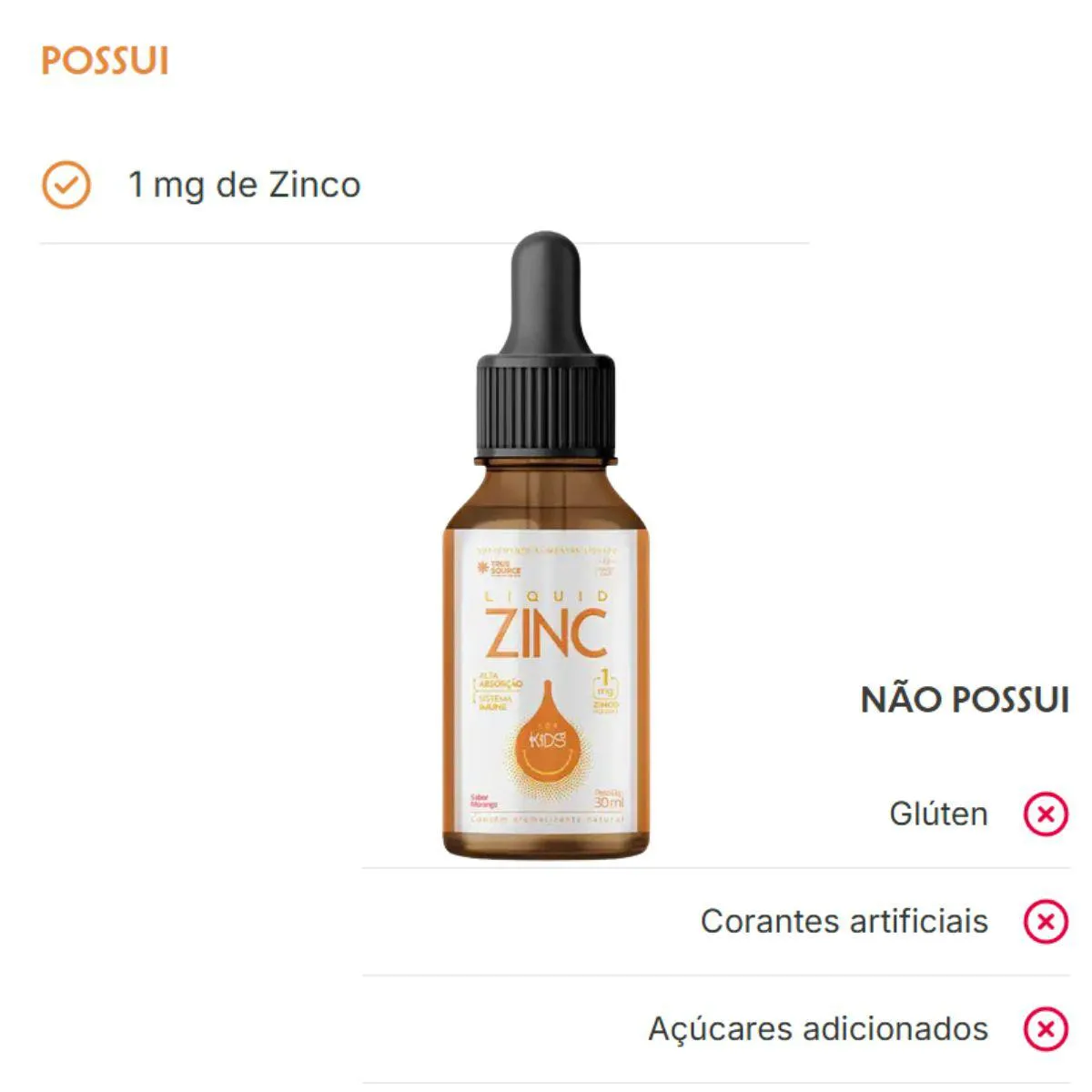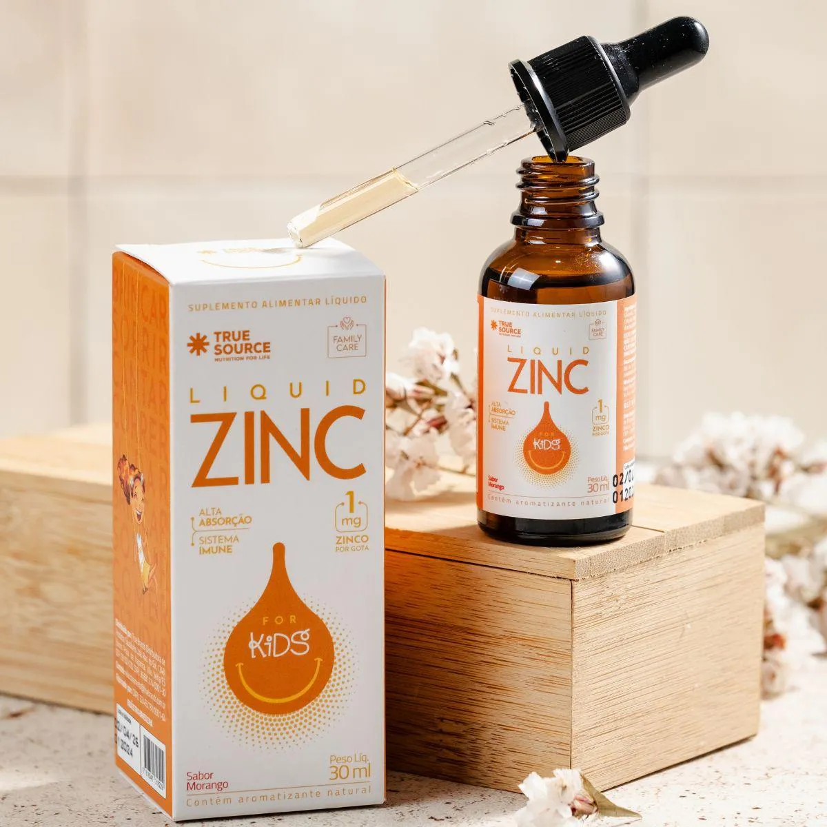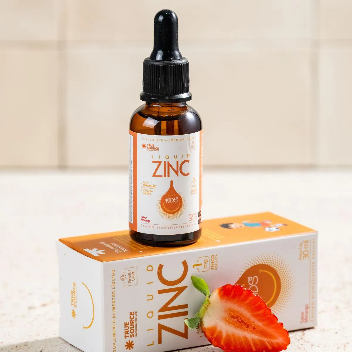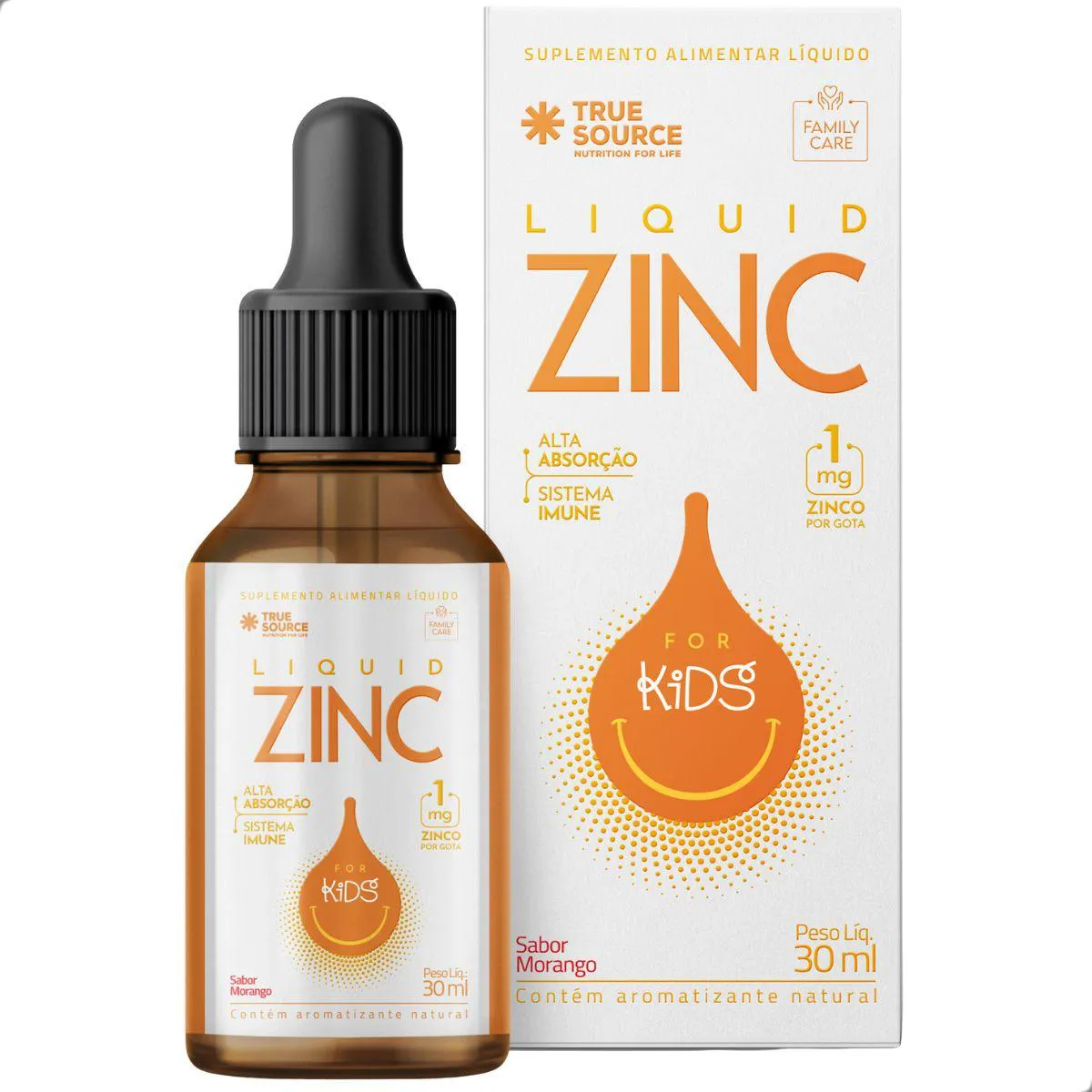 É um suplemento infantil de zinco em formato líquido e gotas, desenvolvido pela marca True Source para oferecer uma solução nutricional prática e premium. Serve para apoiar a nutrição infantil, permitindo um aporte de zinco de forma simples e precisa, que pode ser incorporado em bebidas ou alimentos do dia a dia, auxiliando no bem-estar e na alimentação balanceada de crianças.