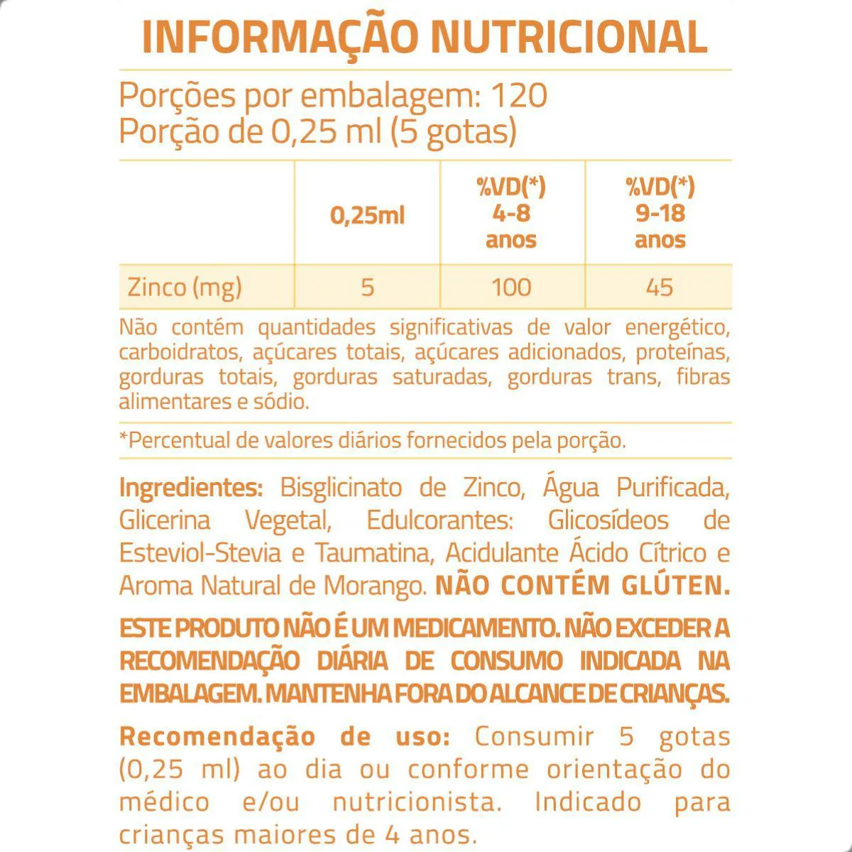 - Suporte nutricional infantil com zinco em formato líquido de fácil administração.