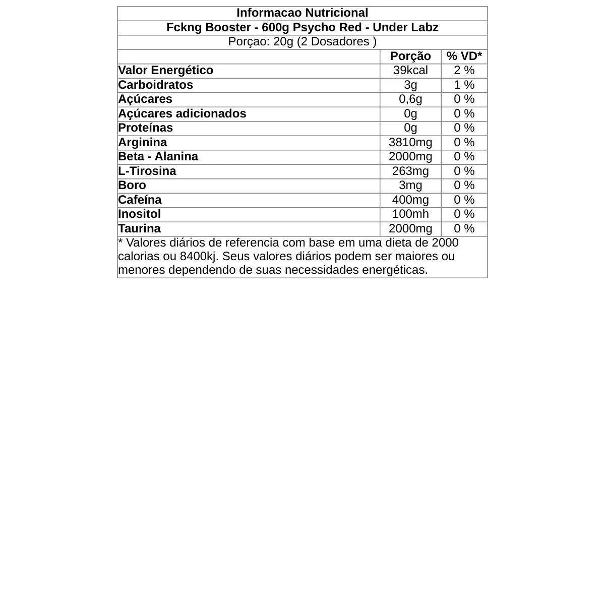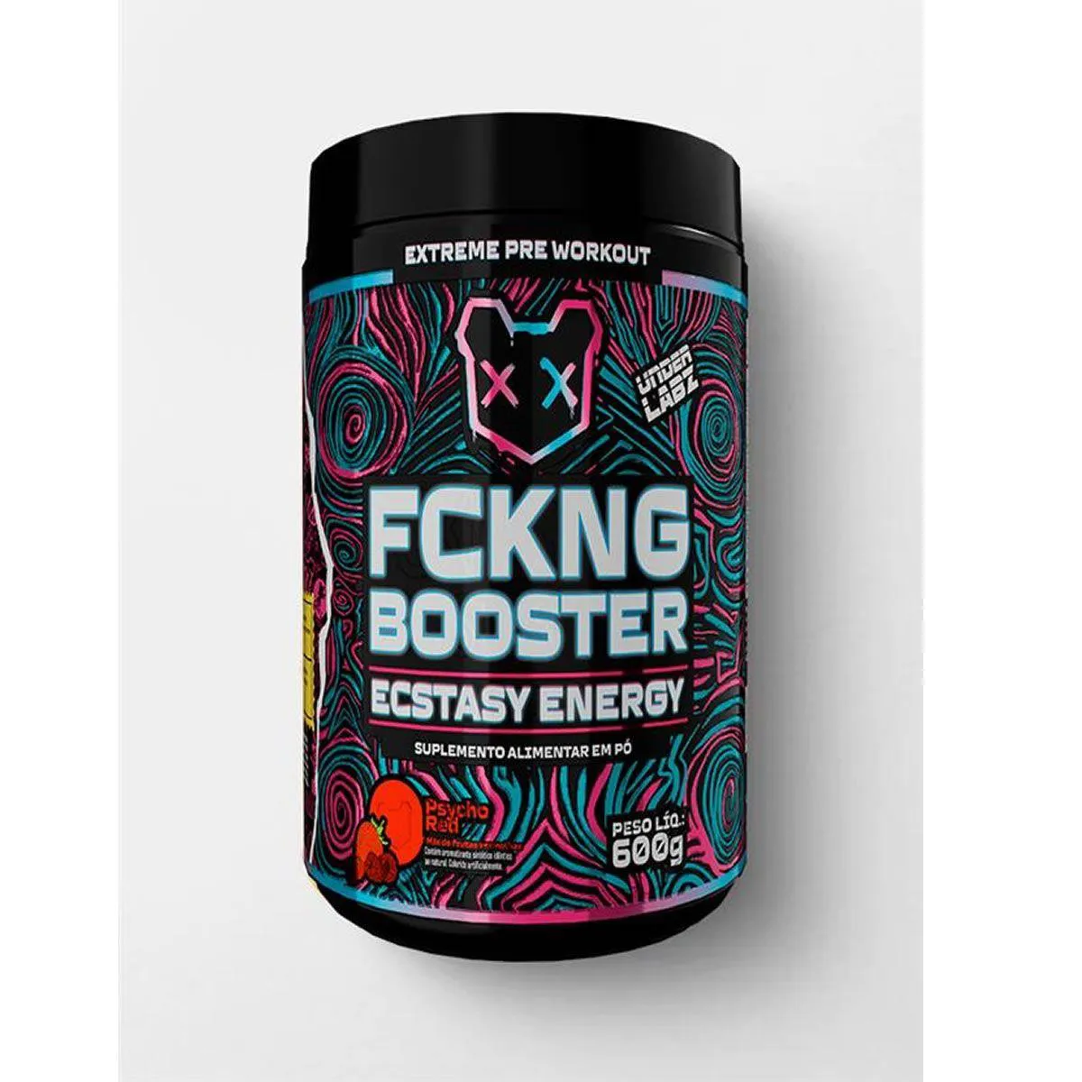 O Fckng Booster 600g Psycho Red, da Under Labz, é um pré-treino desenvolvido para oferecer uma experiência de energia extrema, foco intenso e sensação de euforia durante o treino. Com uma proposta ousada, ele foi criado para quem busca alto desempenho físico e mental, trazendo o conceito de euforia de uma rave no corpo com a clareza de um atleta na mente. Sua fórmula combina ingredientes potentes como cafeína (400#8239;mg por dose), beta-alanina, taurina, L-arginina, L-tirosina, inositol e boro, que atuam de forma sinérgica para aumentar a resistência, intensificar o foco e promover vasodilatação.